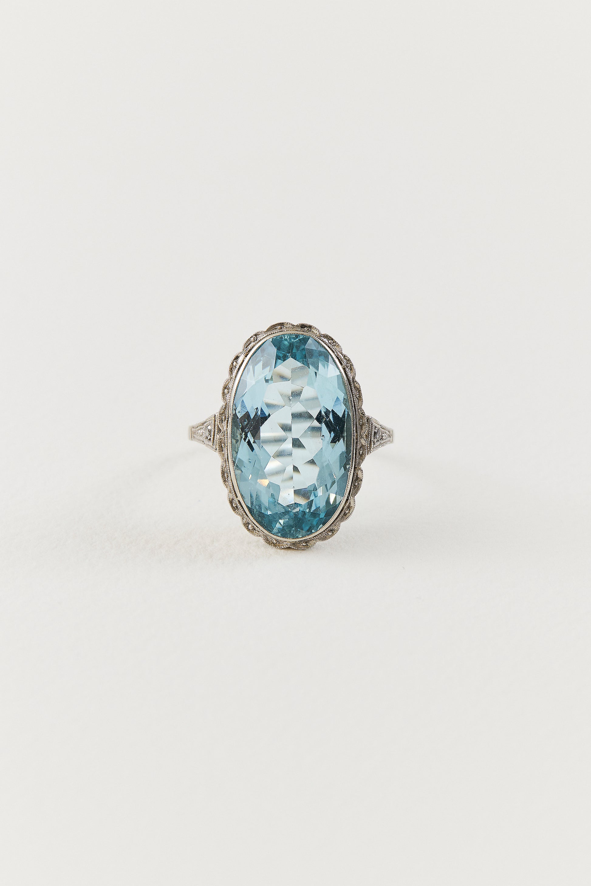 Heirloom elegance prevails with this magnificent Art Deco Aquamarine Ring. Handcrafted in the 1920s, this ring showcases a highly coveted Santa Maria aquamarine of 10.40ct as the focal point of the piece. Bordering the central stone and adorning the shoulders of the ring is filigree detailing that interplays scalloped motifs with milgrain framing, as well as two round-cut diamonds (0.02tcw). Embellishing this are two old-cut diamonds that add a quiet opulence to this spectacular period piece. Crafted in 14K white gold, this piece showcases the craftsmanship and intricate design language of the Art Deco period.