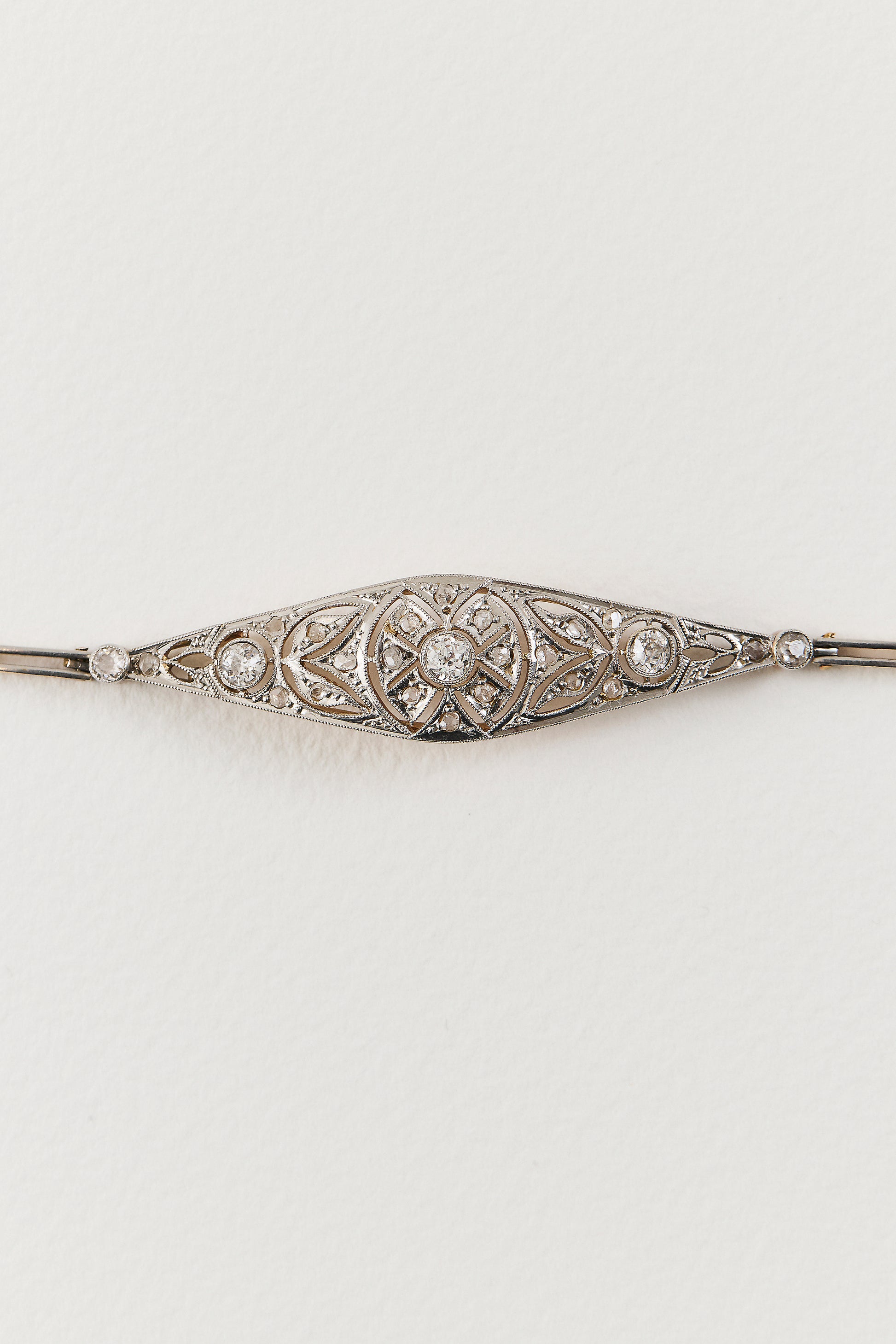 This breathtaking Art Deco bracelet, circa 1920, showcases a geometric mosaic of twenty-five Old European-cut diamonds totalling 0.70ct. Crafted from polished platinum and 14K yellow gold, this masterpiece embodies the innovative spirit and exceptional craftsmanship that define the European Art Deco era. A rare and precious antique treasure, it is destined to be cherished as a family heirloom for generations to come.