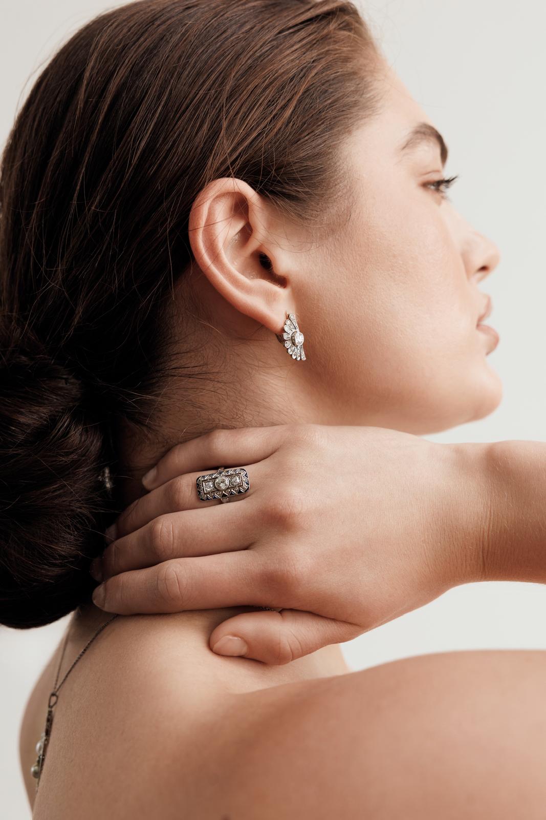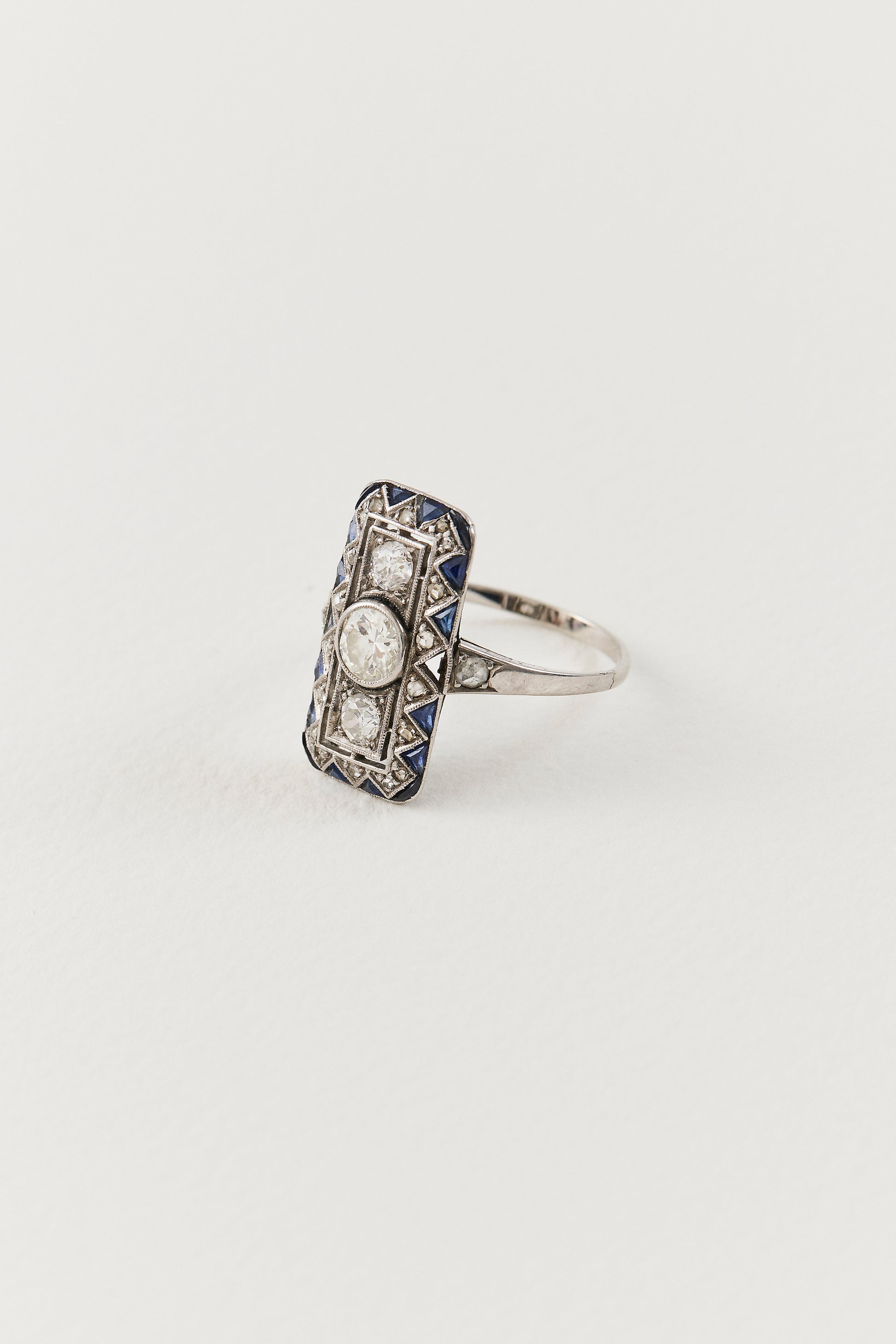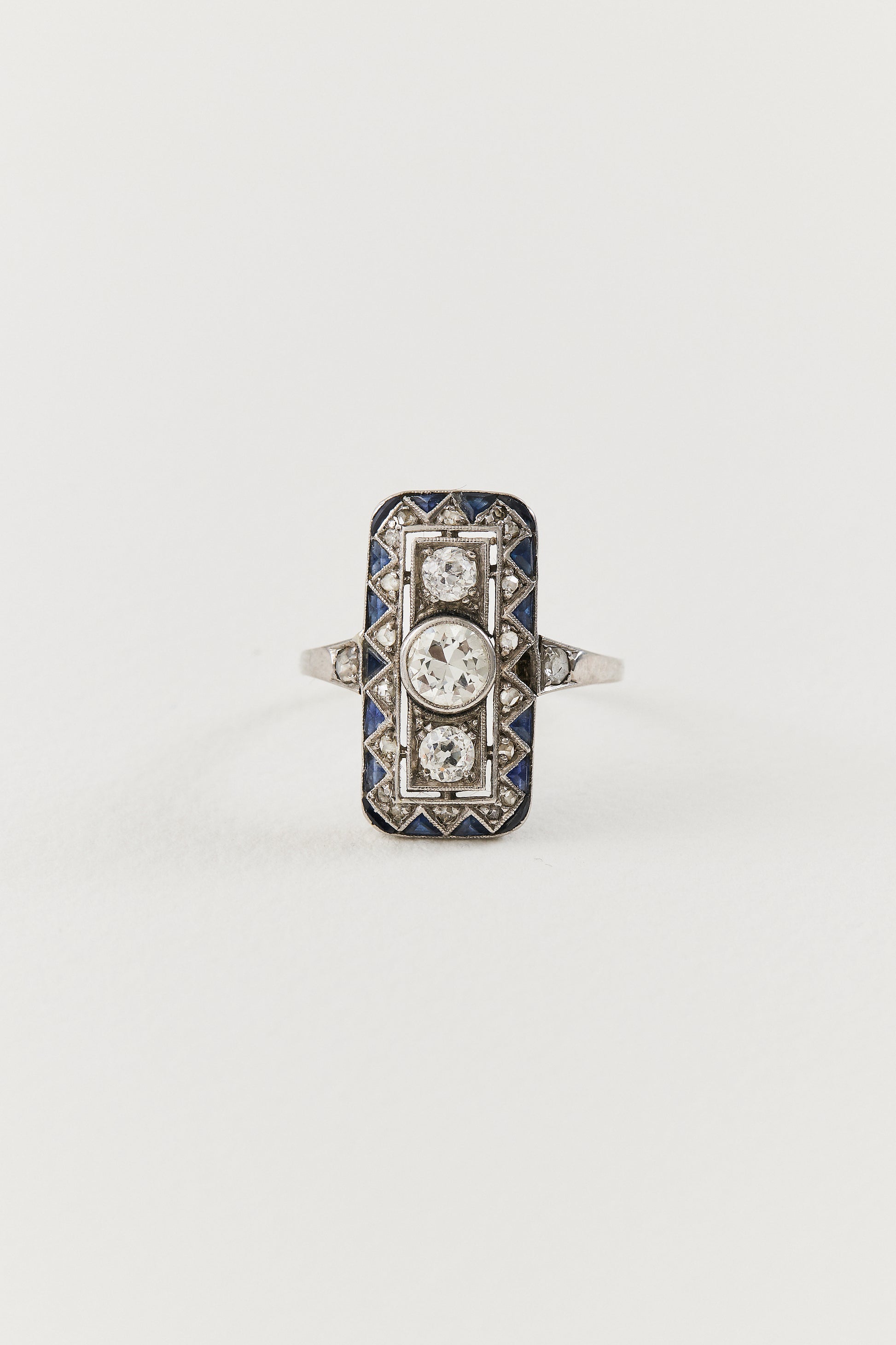 Heirloom elegance is honoured in this masterfully constructed Art Deco Diamond Dinner Ring, a true testament to 1920s craftsmanship. Showcasing a 0.50ct Old European-cut diamond in the centre, two smaller Old European-cut diamonds totalling 0.30ct complement the central diamond, balancing the design with grace. The addition of 0.36ct of sapphires and 0.20ct of accenting Old European diamonds adds a touch of texture to this lustrous ring, while the low-profile setting allows for effortless, everyday wear. Crafted in polished platinum, the design is defined by a north-to-south composition, its elongated silhouette reflecting the architectural clarity of the era.