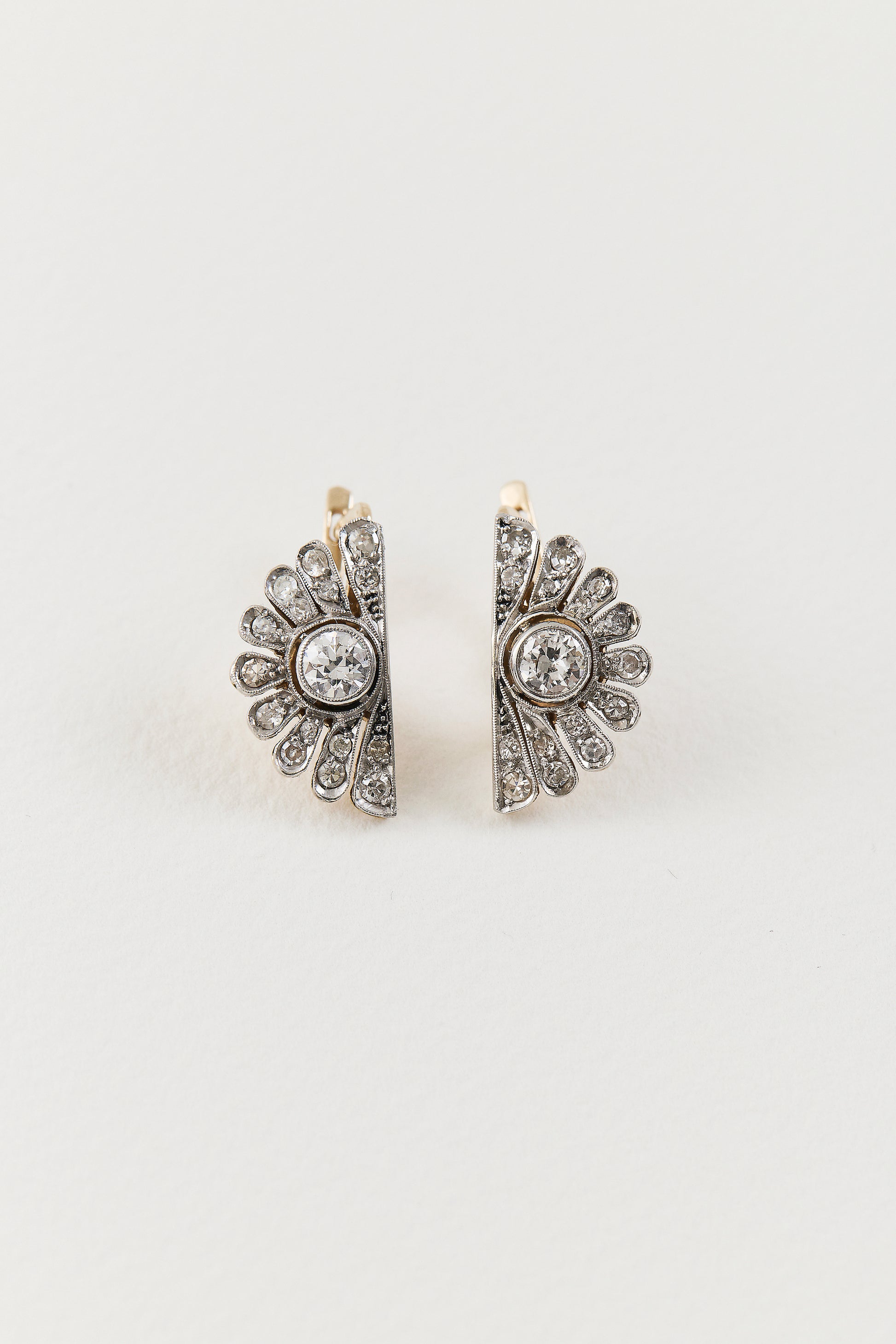 Sculptural elegance meets the resplendence of antique diamonds in these exquisite Art Deco fan earrings. Two Old European-cut diamonds totalling 1.00ct are complemented by thirty smaller Old European-cut diamonds. Crafted in platinum and 14K yellow gold, each frond is intricately adorned to capture the artistry of its era, embodying the geometric grace and refined allure synonymous with the Art Deco movement.