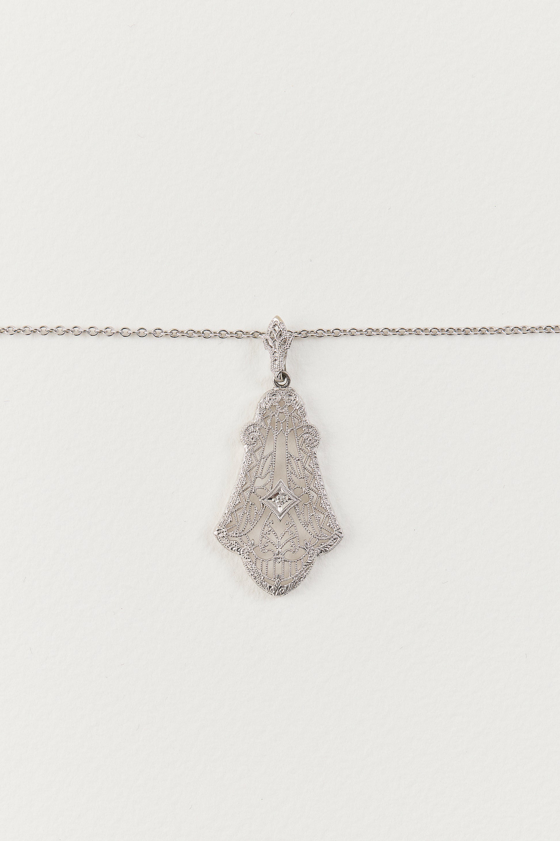 An artful play on femininity, this Art Deco Diamond Pendant. Crafted in 14K white gold, this exquisite piece features intricate garland detailing, openwork and milgrain edges, creating a lace-like filigree. A singular Old European-cut diamond graces the centre of the pendant, adding a touch of opulence to this magnificent piece.