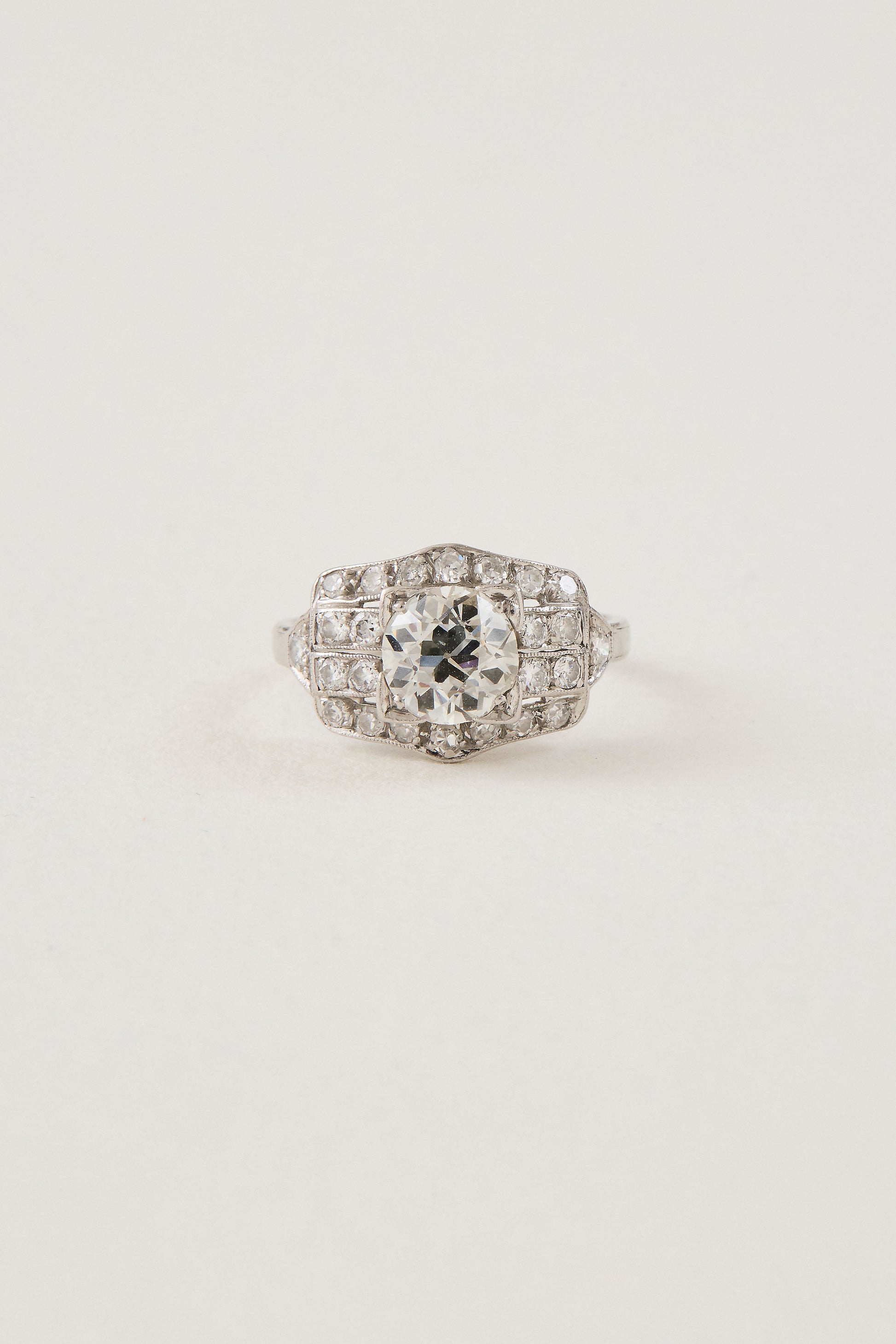 Heirloom elegance is honoured in this masterfully constructed Art Deco ring, a true testament to 1920s craftsmanship. Showcasing a luminous old-cut diamond at its centre, the ring is framed by a meticulous arrangement of 24 smaller old-cut diamonds. The stepped, rectangular composition of the ring is defined by structured rows of diamonds, bordered by fine platinum bars that create a striking grid-like effect, an ode to the geometric precision of the era. Milgrain edging adds delicate texture and vintage refinement, softening the bold linearity of the design. Crafted in platinum, this piece captures the spirit of Art Deco elegance with exceptional detail and timeless allure.