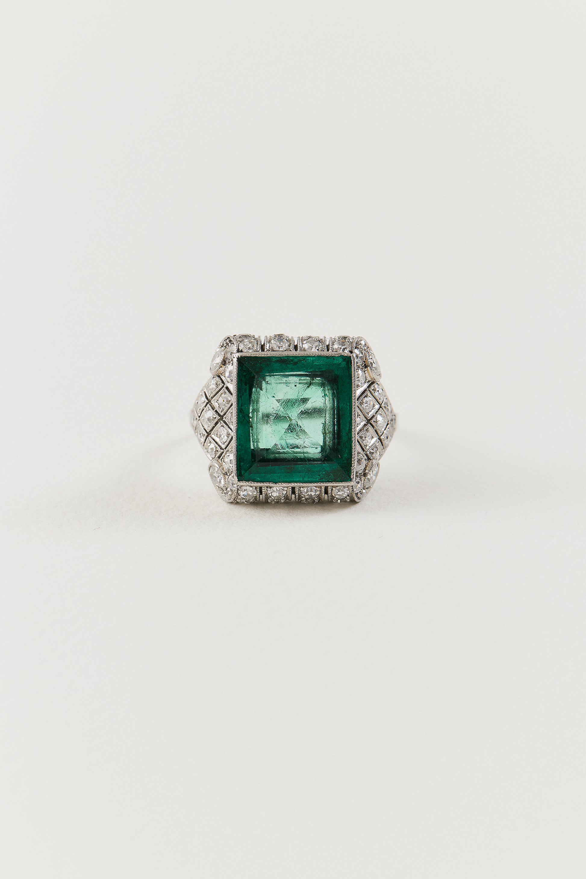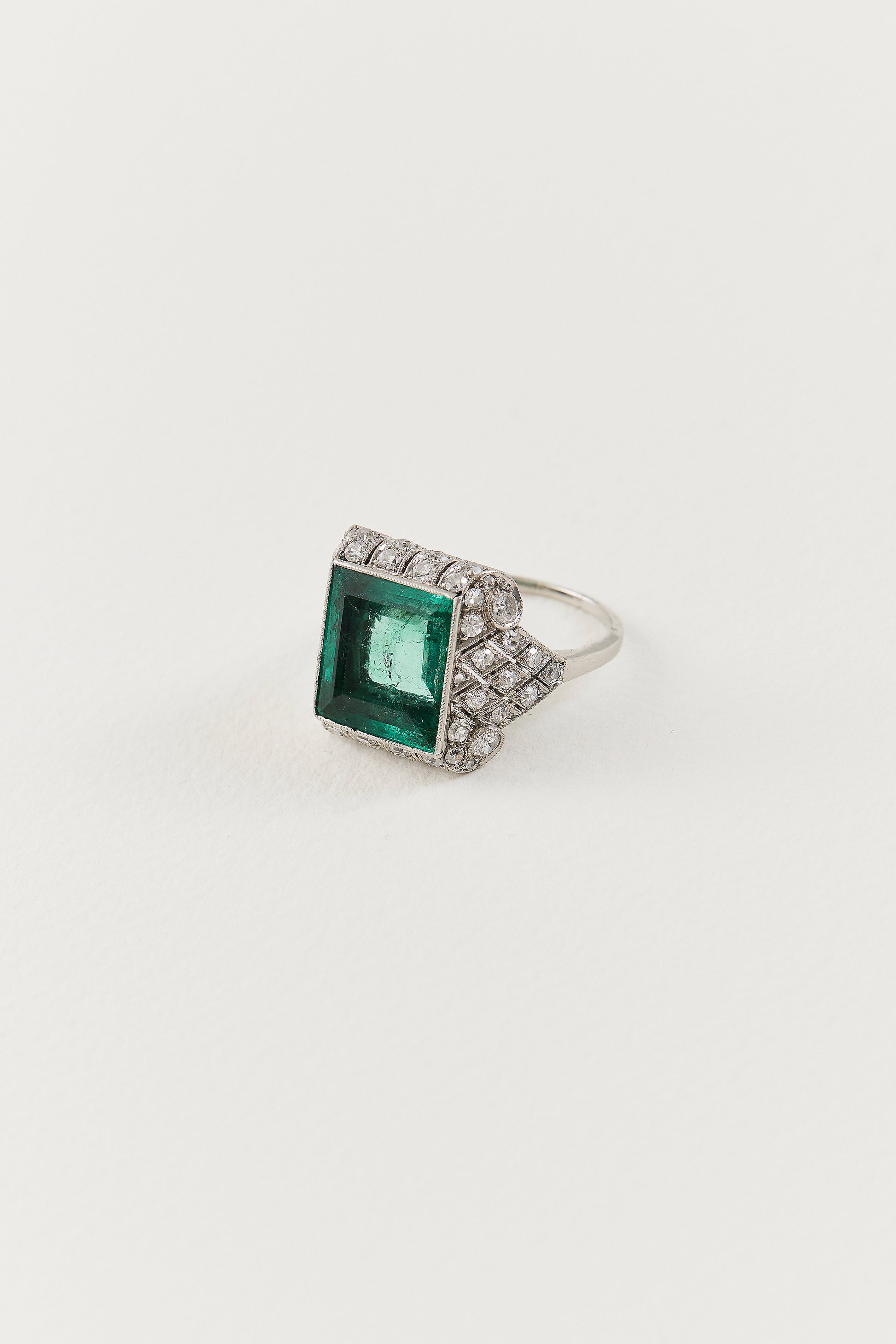 Heirloom elegance prevails with this magnificent Art Deco Emerald Ring. Handcrafted in the 1920s and featuring distinctly bold geometric details of the era, this ring showcases a vivid square-cut emerald of 5.08ct as its centrepiece. Bordering the emerald are fifty Old European-cut diamonds (1.09ct total), adding a prominent opulence to this spectacular period piece. Milgrain detailing, curvature and triangular motifs adorn the shoulders of the ring, showcasing the craftsmanship and intricate design language of the Art Deco period. Crafted in platinum, this exquisite piece is destined to be cherished now and treasured as a future heirloom.