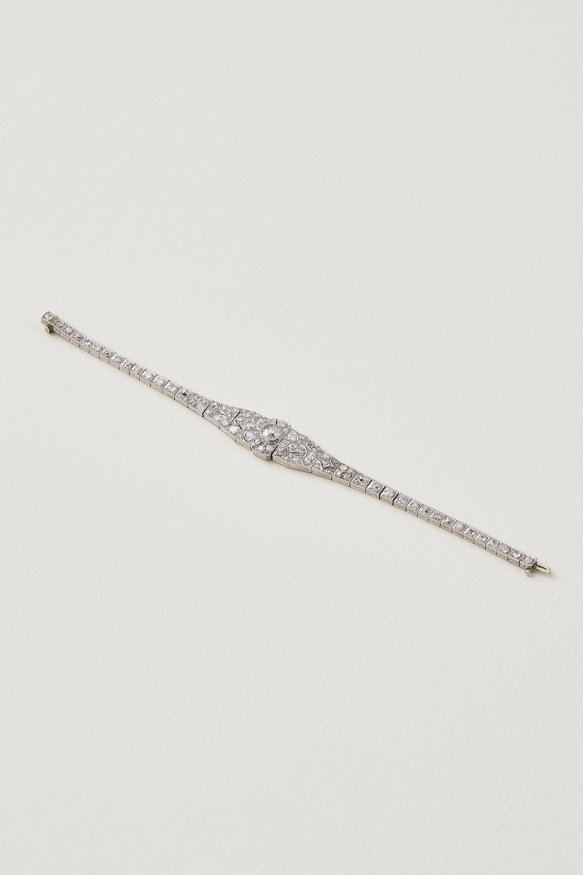 This breathtaking French Art Deco bracelet, circa 1920, showcases a magnificent 1.05ct old-cut diamond at its centrepiece, surrounded by a geometric mosaic of seventy-seven diamonds totalling 5.69ct. Crafted from polished platinum, this masterpiece embodies the innovative spirit and exceptional craftsmanship that define the French Art Deco era. A rare and precious antique treasure, it is destined to be cherished as a family heirloom for generations to come.