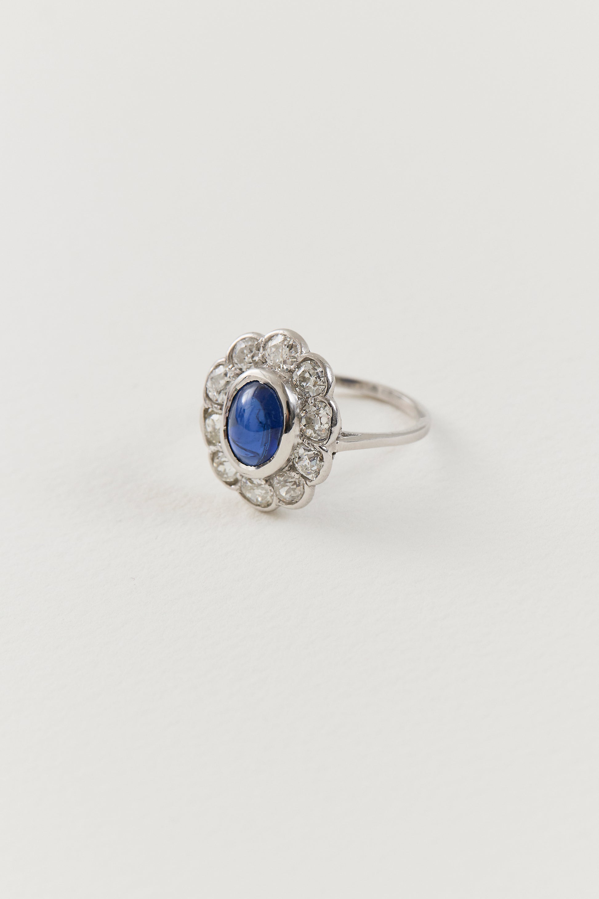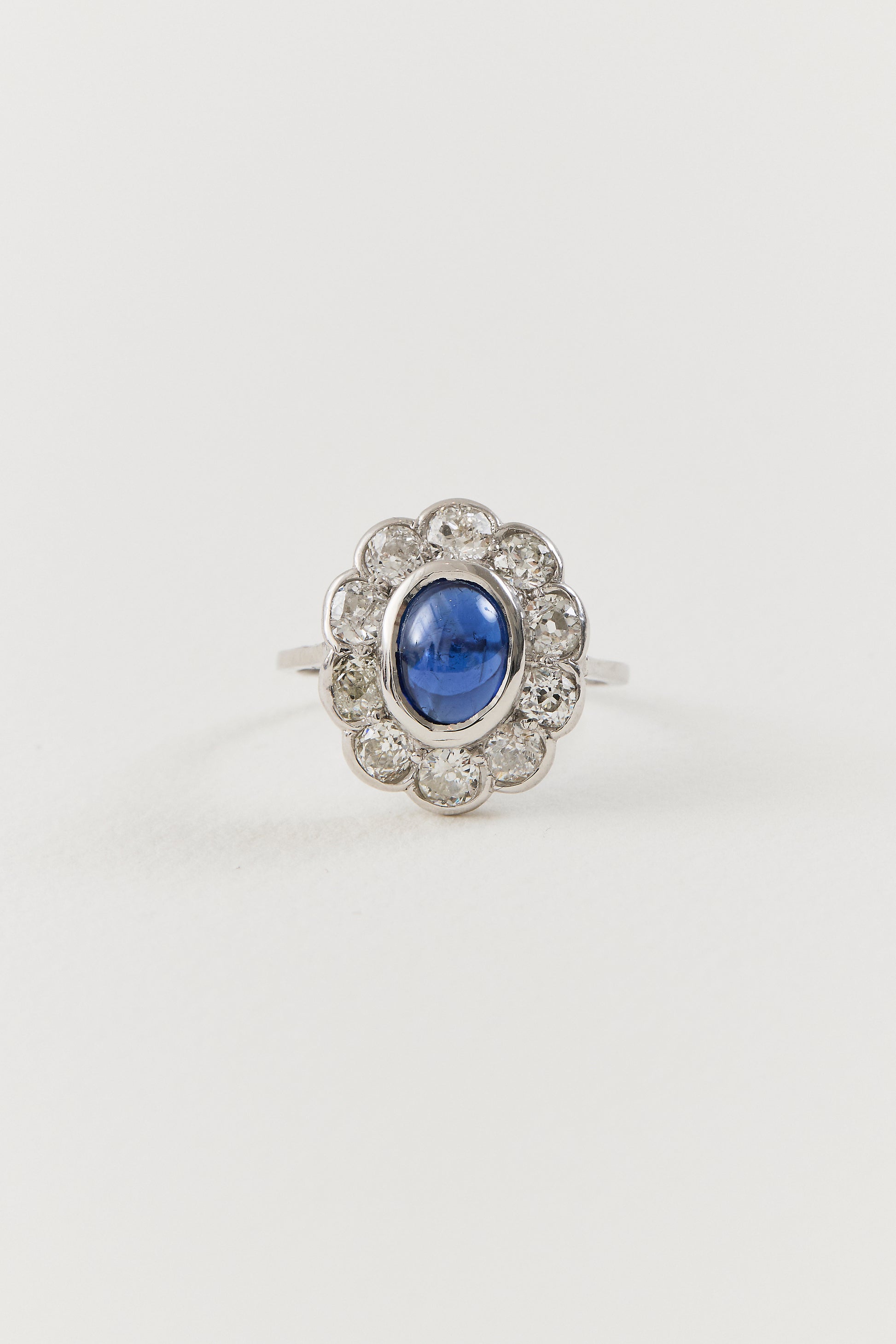 Imbued with the perfect synthesis of Art Deco artistry and visionary femininity, this breathtaking ring, circa 1920, is a true embodiment of timeless luxury. At its heart lies an opulent 2.72ct oval cabochon sapphire, its blue hue evoking an endless ocean. Encircling the sapphire is a luxurious halo of luminous Old Mine-cut diamonds totalling 1.50ct, creating a backdrop of light and movement. Crafted in 18K white gold and platinum, this statement ring exudes enduring sophistication, indicative of Art Deco craftsmanship and foundational elegance.
