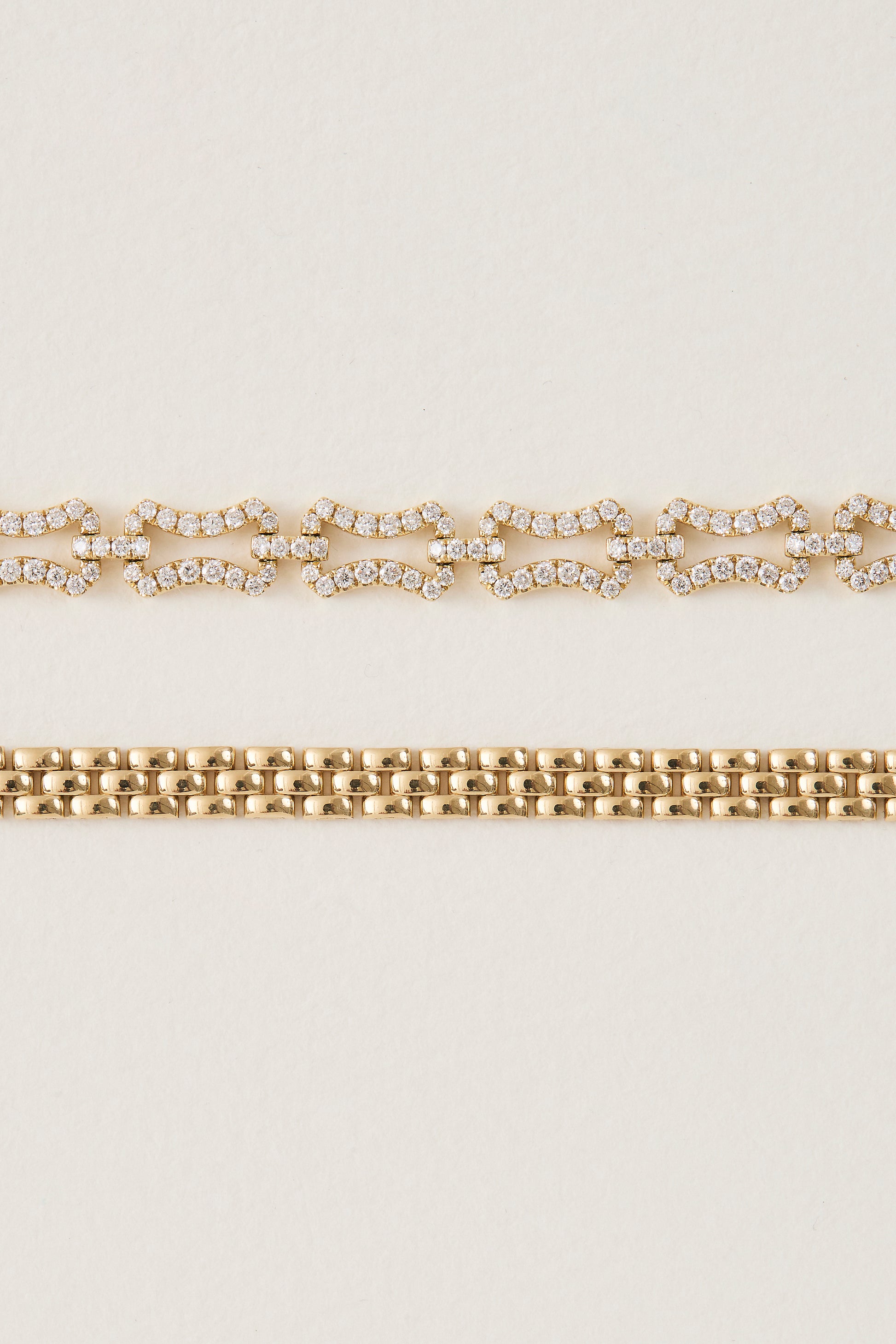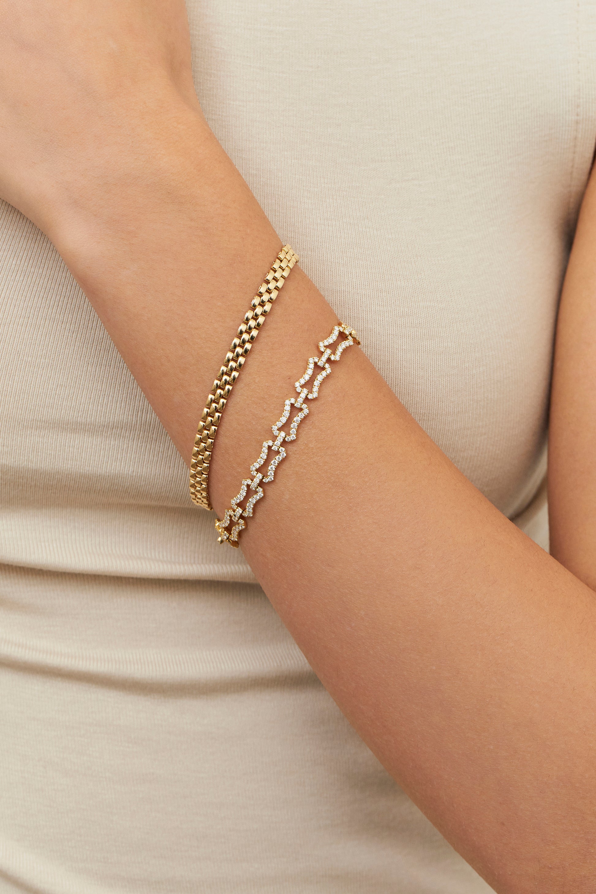 A testament to refined elegance, this exquisite diamond bracelet is adorned with 281 resplendent round-cut diamonds totalling 3.34ct. Each stone has been selected for its exceptional quality, brilliance and faceted luminosity. Crafted in 18K yellow gold, this bracelet features a wavy design, with each link comprising two rows of diamonds that are connected by a diamond bar. This creates a sense of movement and fluidity and exudes refined luxury and enduring elegance.