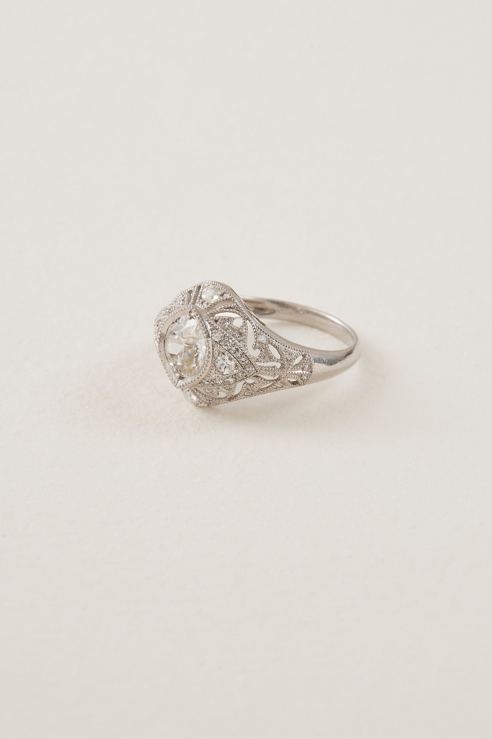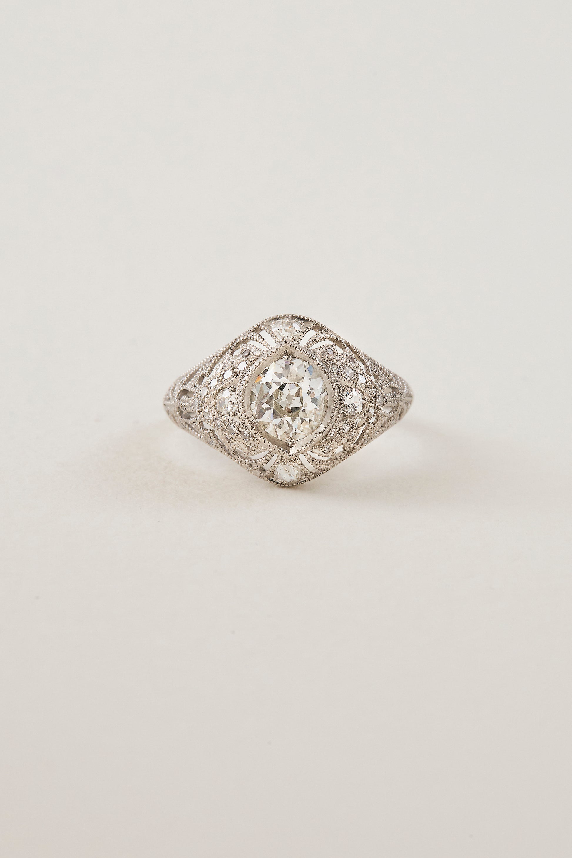 Art Deco aesthetics take a modern approach with refined geometric elegance in this masterfully crafted diamond dome ring. At its heart, a breathtaking 1.12ct brilliant-cut diamond is bezel-set with fine milgrain detailing, gracefully centred within a navette-shaped dome. Accentuating the central stone are thirty-two luminous diamonds (totalling 0.46ct) which are intricately enhanced by delicate hand piercing and filigree detail. The detailed dome displays a harmonious interplay of graceful curves and an array of shapes, a tribute to early Art Deco design. Crafted in platinum, this ring represents Keshett’s foundational approach to reinterpreting traditional Art Deco design with sophisticated artistry and timeless appeal.