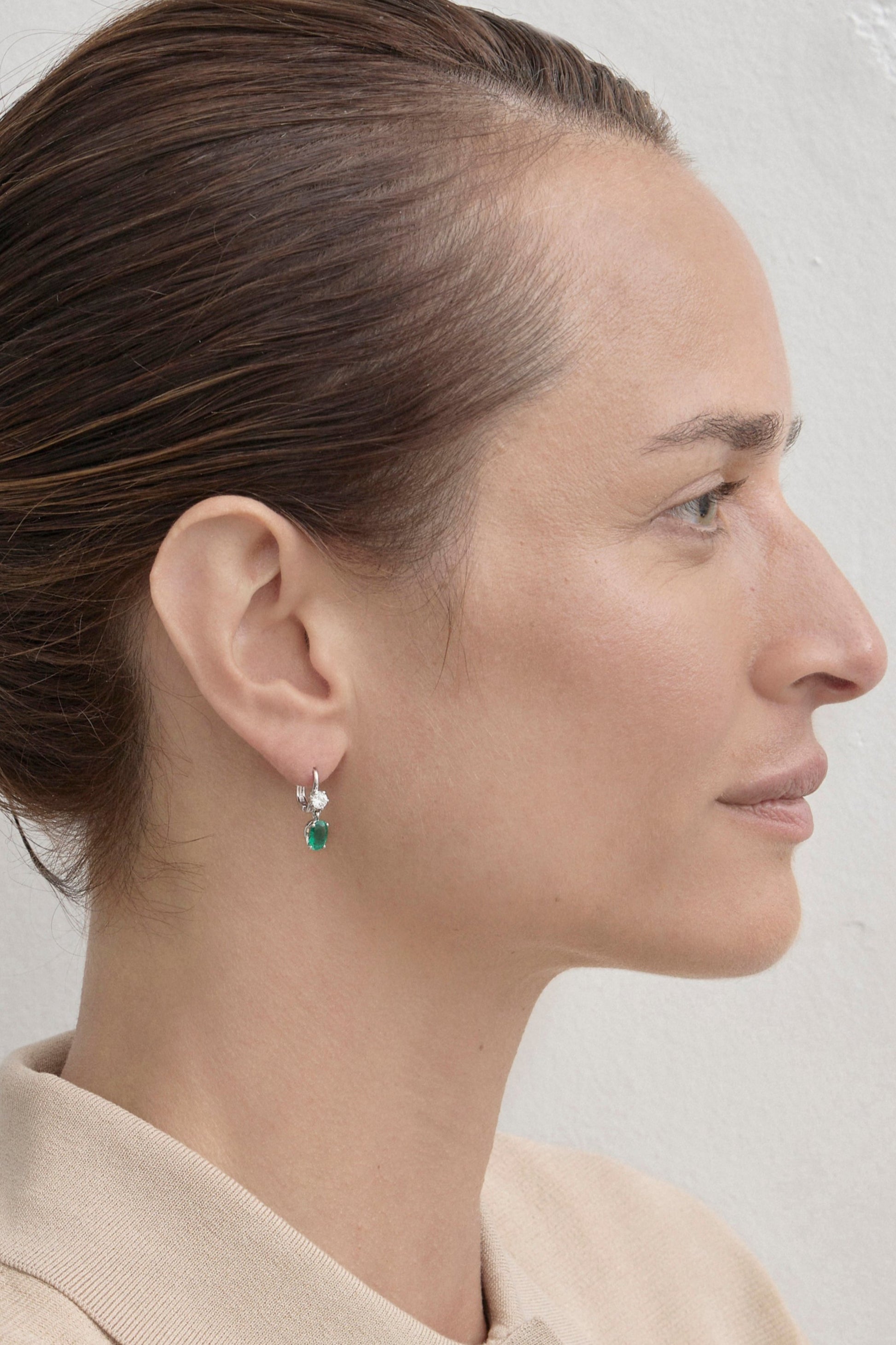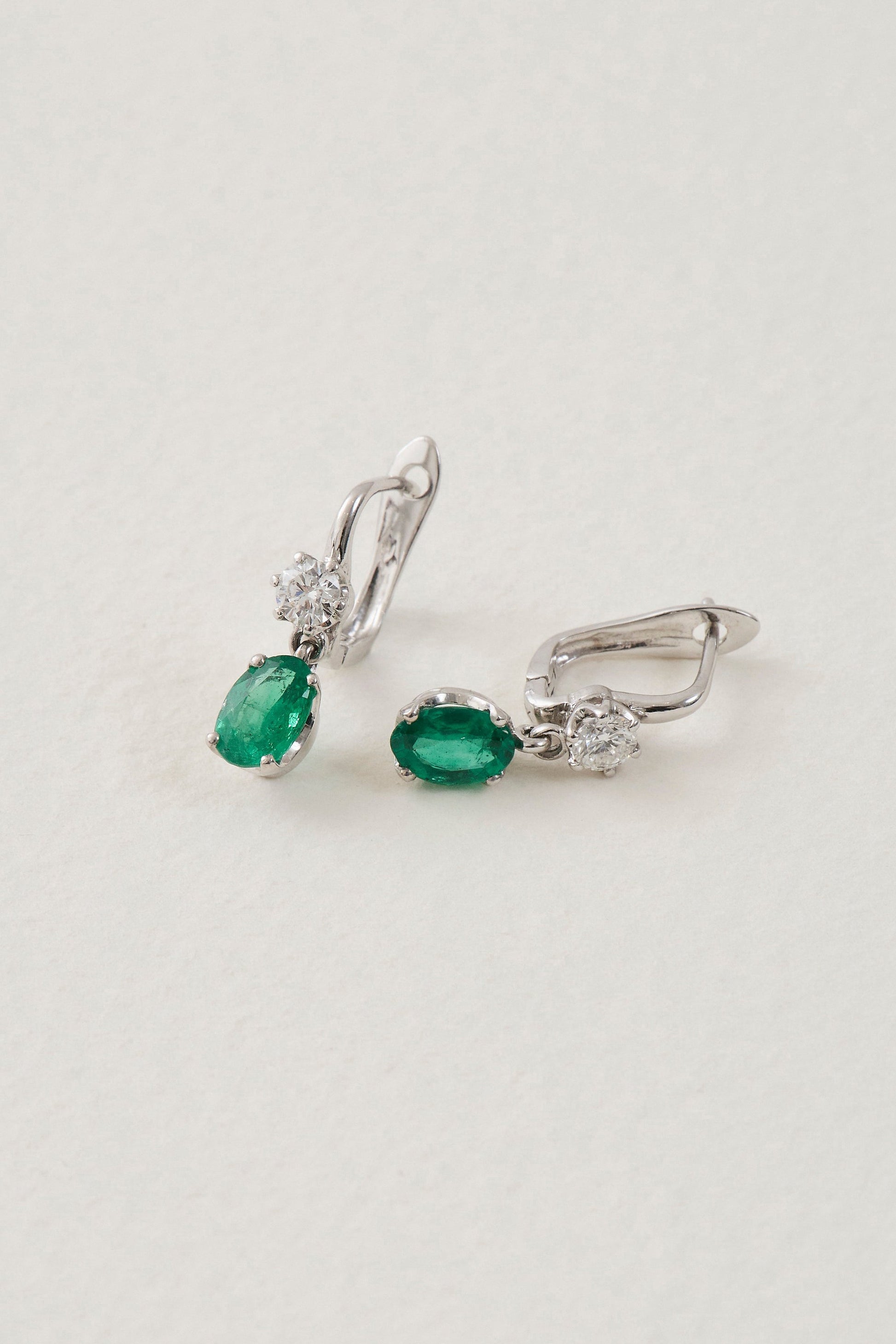 Imbued with the innate elegance that is synonymous with Keshett, modern opulence interplays timeless silhouettes with our Emerald and Diamond Drop Earrings. Artfully crafted in 18K white gold, two luminous oval emeralds are suspended by two luxurious brilliant cut diamonds drops. These masterfully crafted earrings showcase a refined sophistication and unparalleled workmanship synonymous with Keshett.