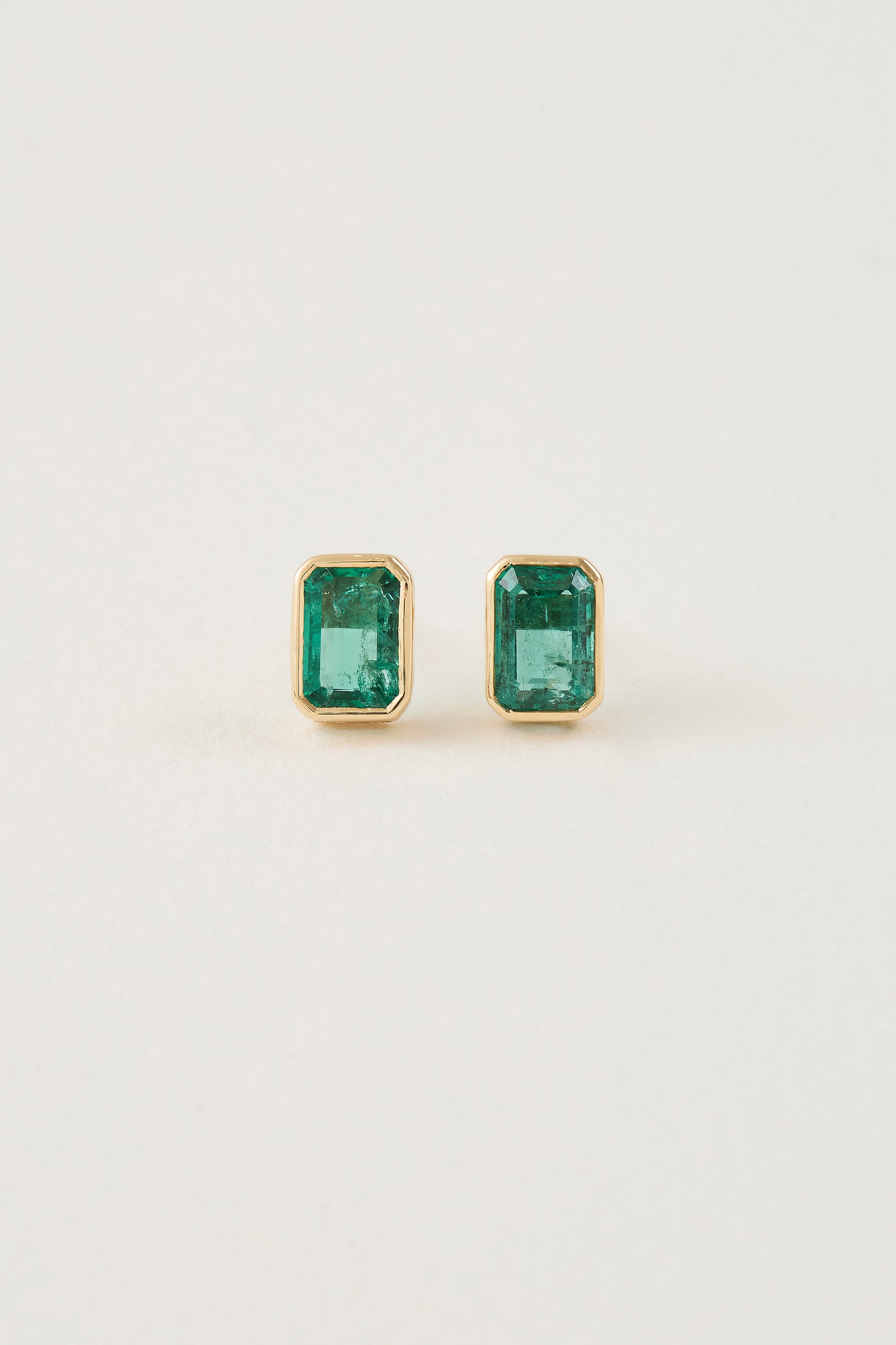 Modern elegance abounds with our emerald bezel studs. Featuring two emerald-cut emeralds weighing a total of 2.45ct and set in the warm embrace of 18K yellow gold, these earrings offer a harmonious blend of minimalist design with underpinned modernist luxury.