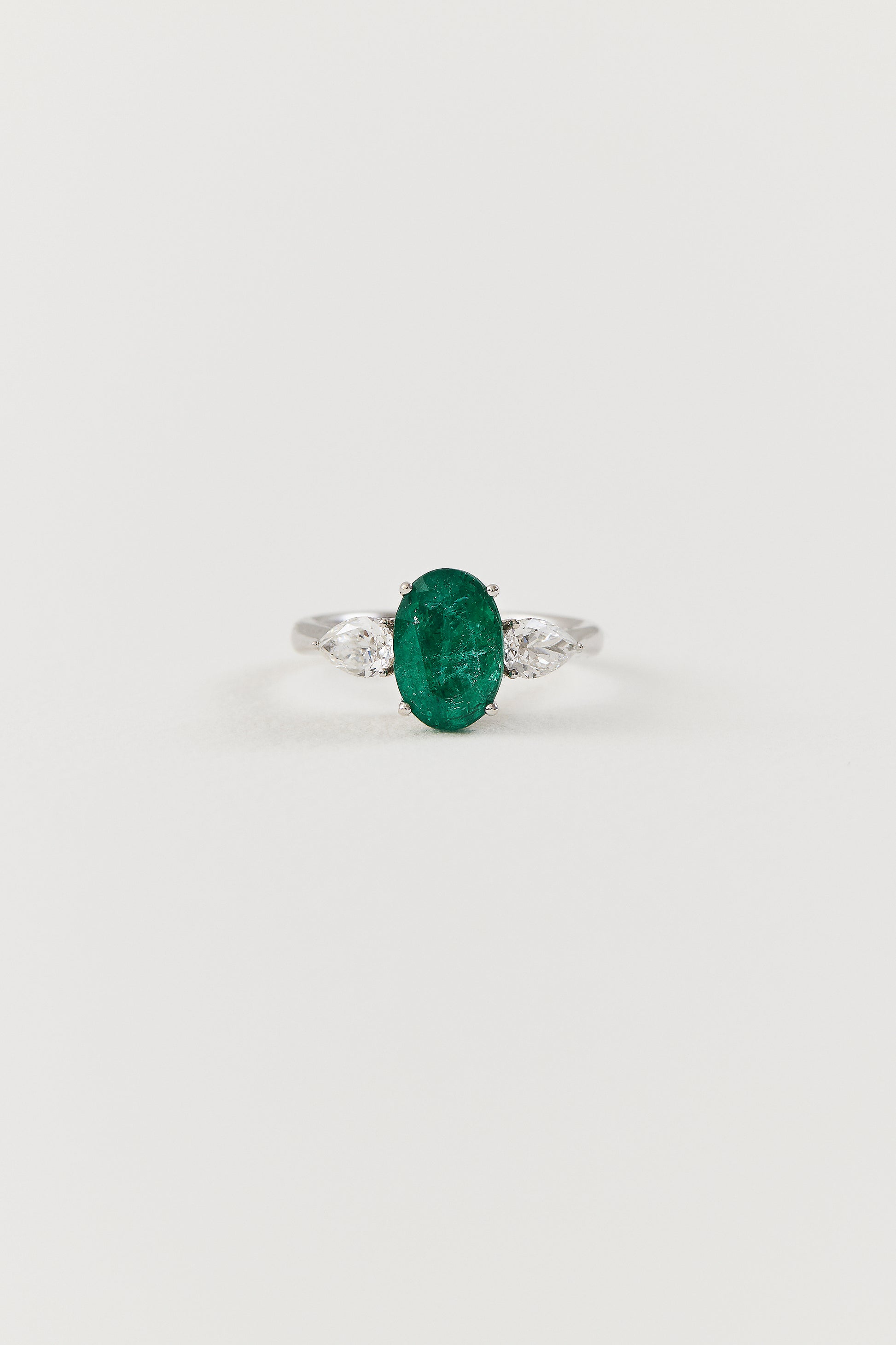 Reflective of Keshett’s foundational elegance and refined craftsmanship, this ring prevails with the resplendence of a 2.46ct oval-cut emerald. Its rich depth of colour and captivating clarity command attention with its natural beauty, artfully balanced by two GIA certified pear-cut diamonds, totalling 0.62ct. Expertly crafted in 18K white gold, this piece reinvents modern luxury with enduring artistry.