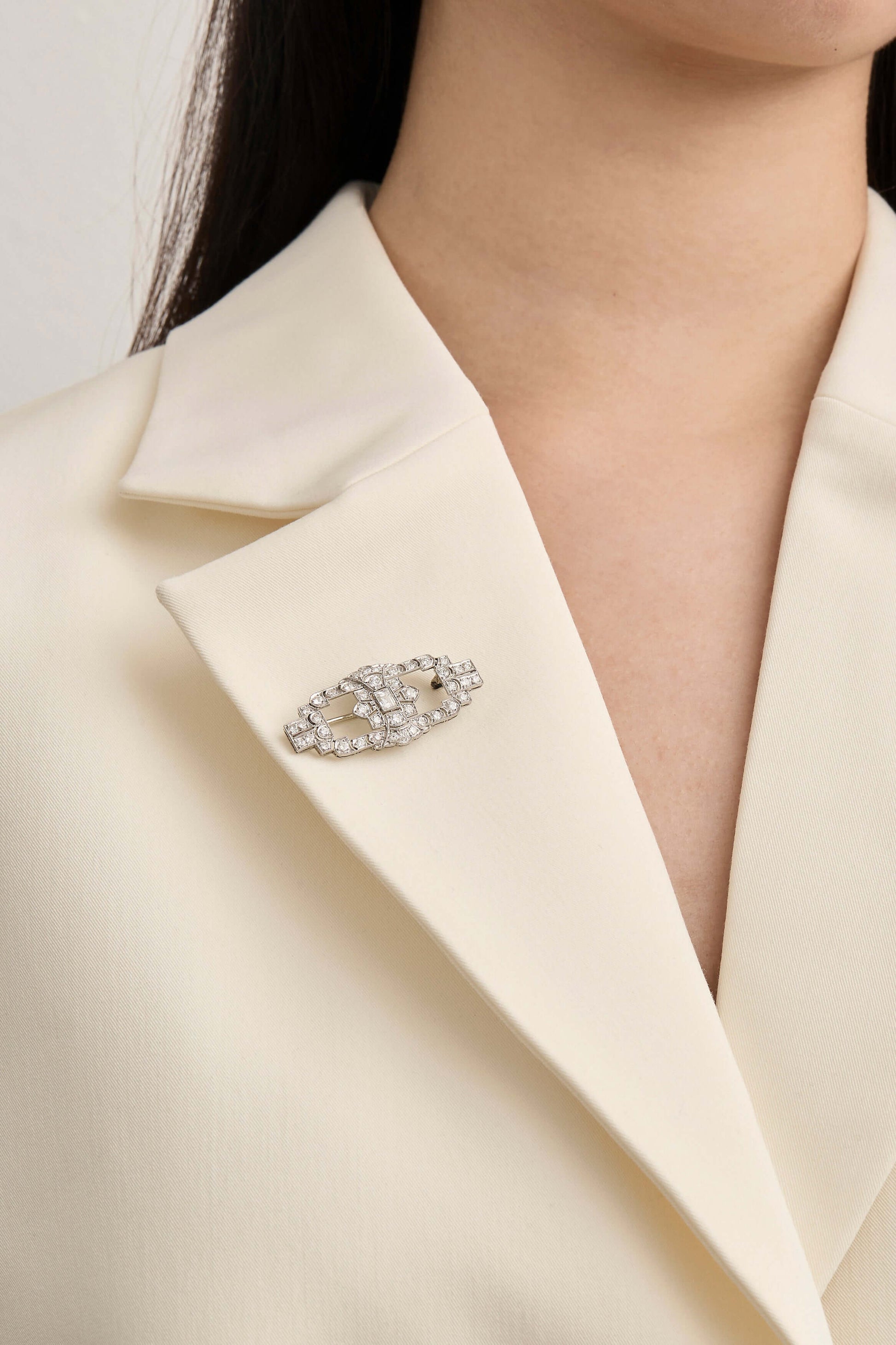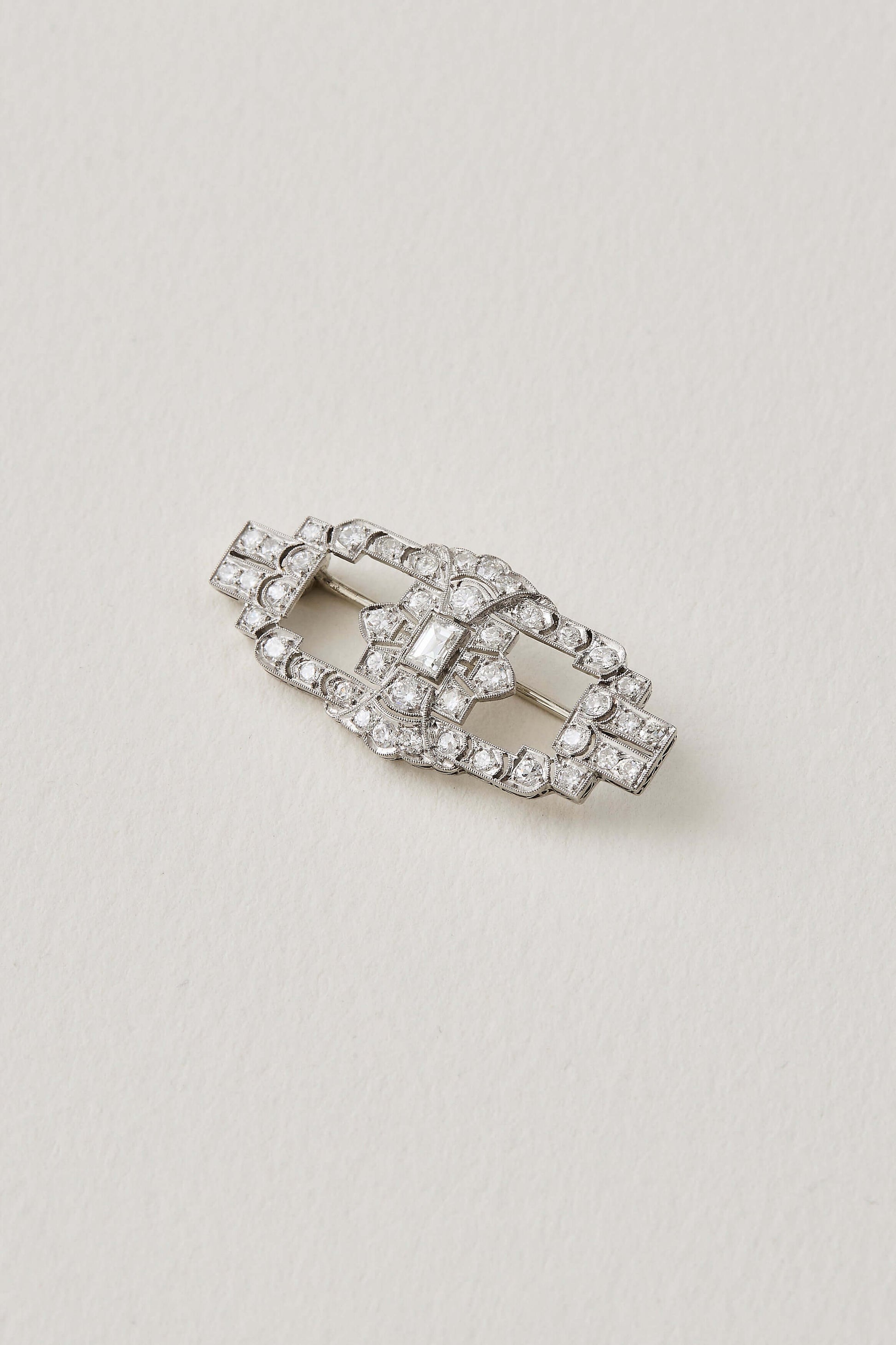 Consummate 1920s French Art Deco artistry is in full effect with this exquisite Diamond Brooch. This masterpiece boasts a symmetrical openwork structure that creates a luminous mosaic of light and structure. At its centre, a prominent baguette-cut diamond (0.30ct) anchors the piece, framed by old-cut diamonds (1.86tcw) set within stepped frames, reflecting the architectural influences of the era. Handcrafted in platinum with fine milgrain edging, this brooch showcases the impeccable craftsmanship and timeless allure of the Art Deco era.