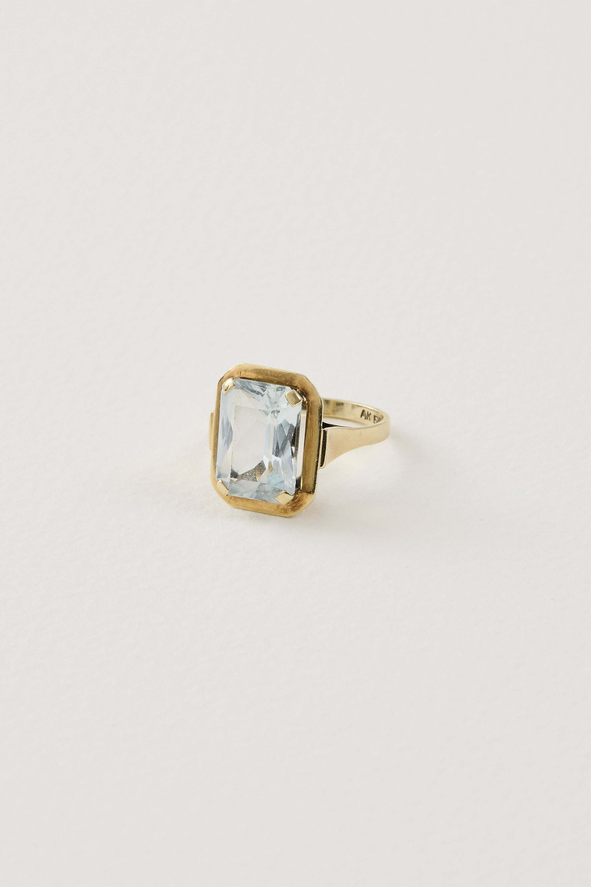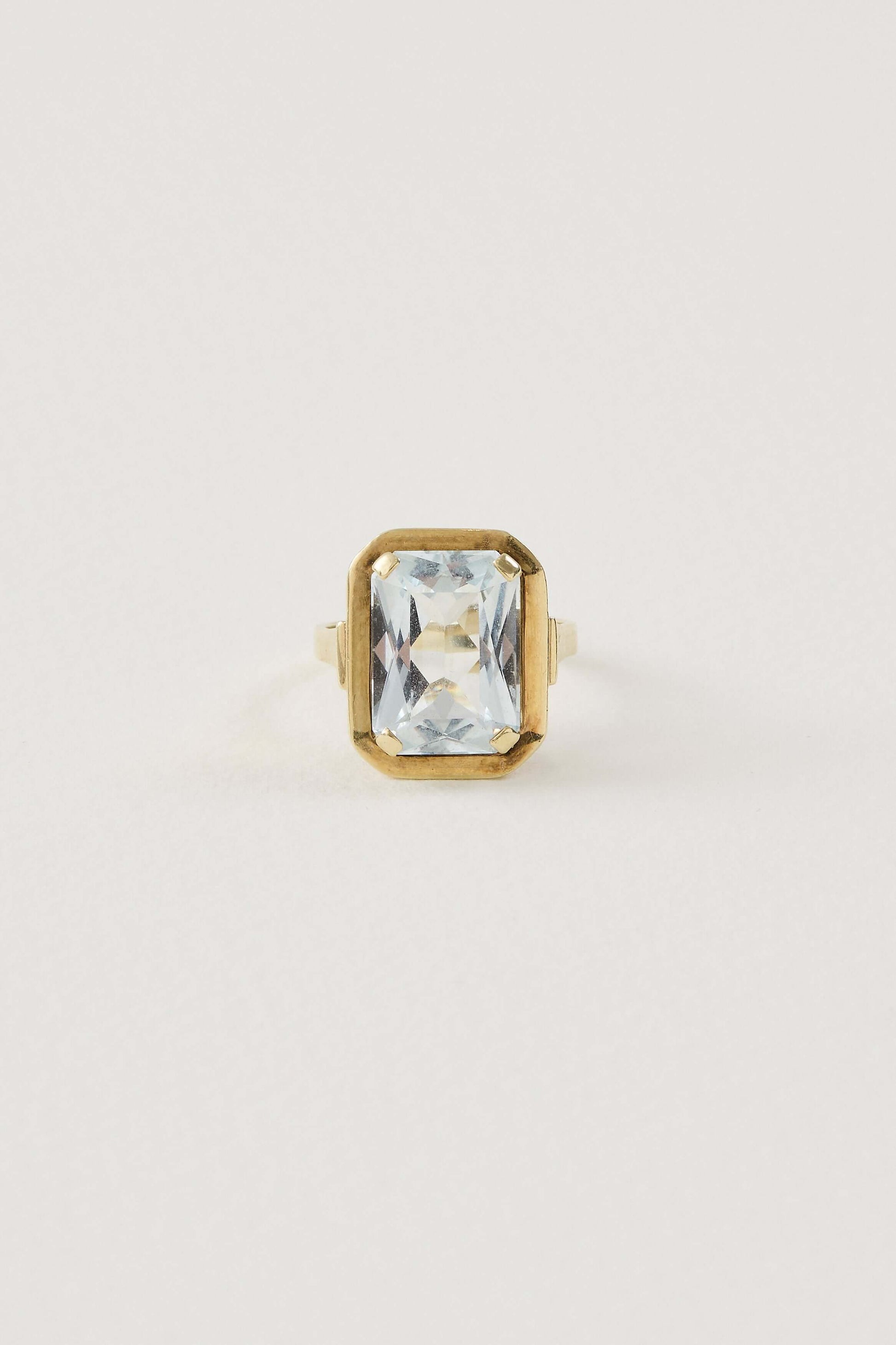 Architectural European vintage silhouettes take centre stage with our Mid Century Aquamarine Ring, circa 1940. Showcasing a coveted 5.80ct aquamarine, with its mesmerising blue hue, this magnificent ring crafted in 14K yellow gold, is a masterful heirloom that evokes a sense of sculptural modernism and enduring sophistication.
