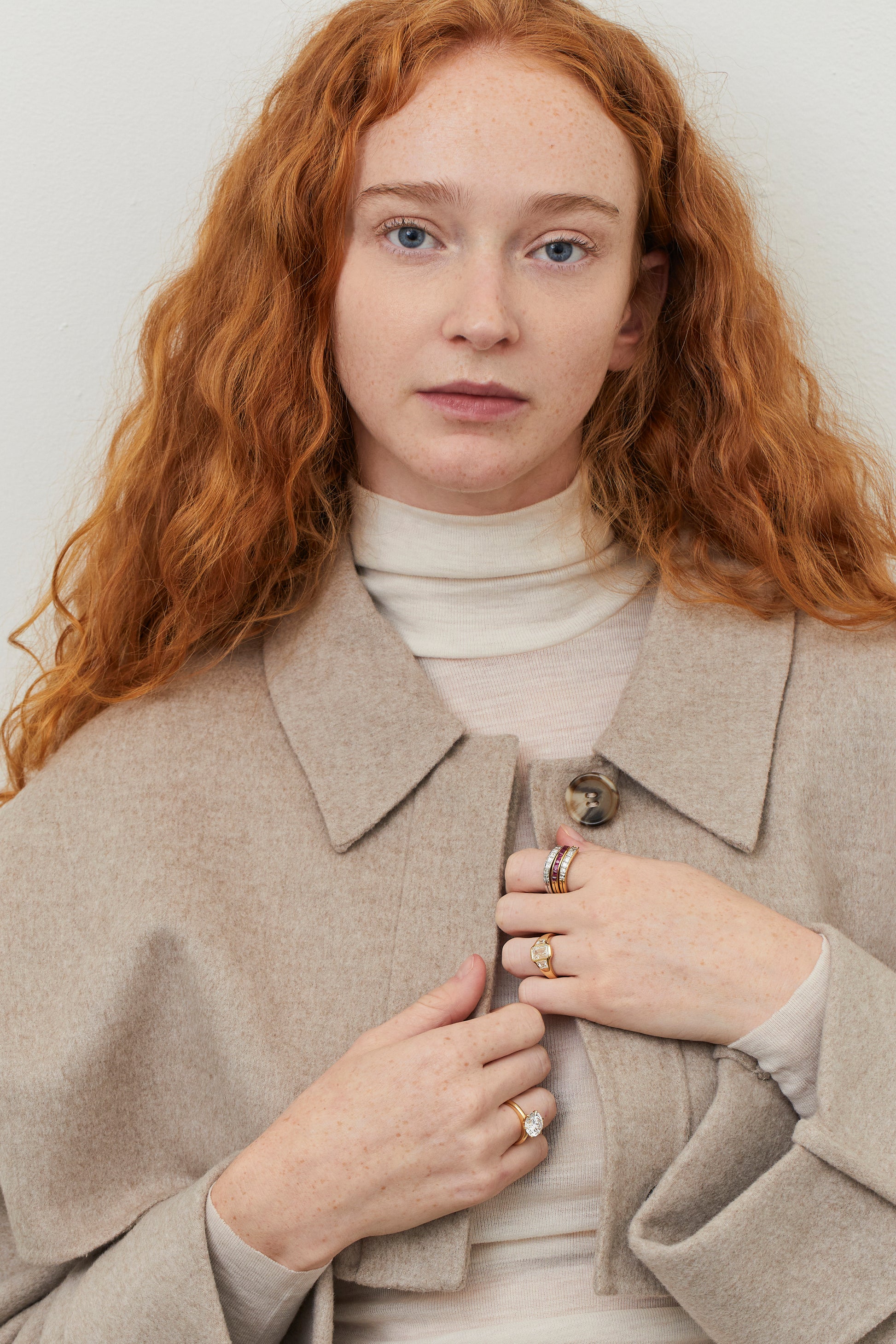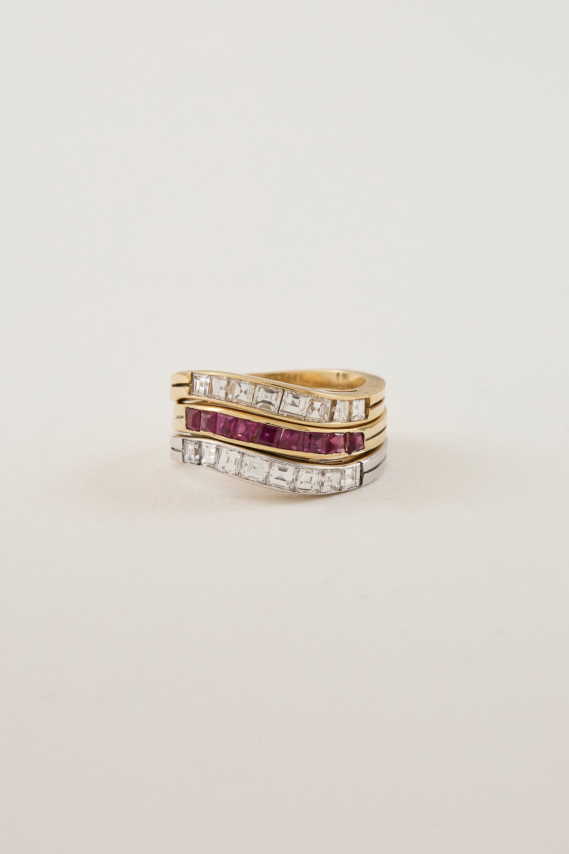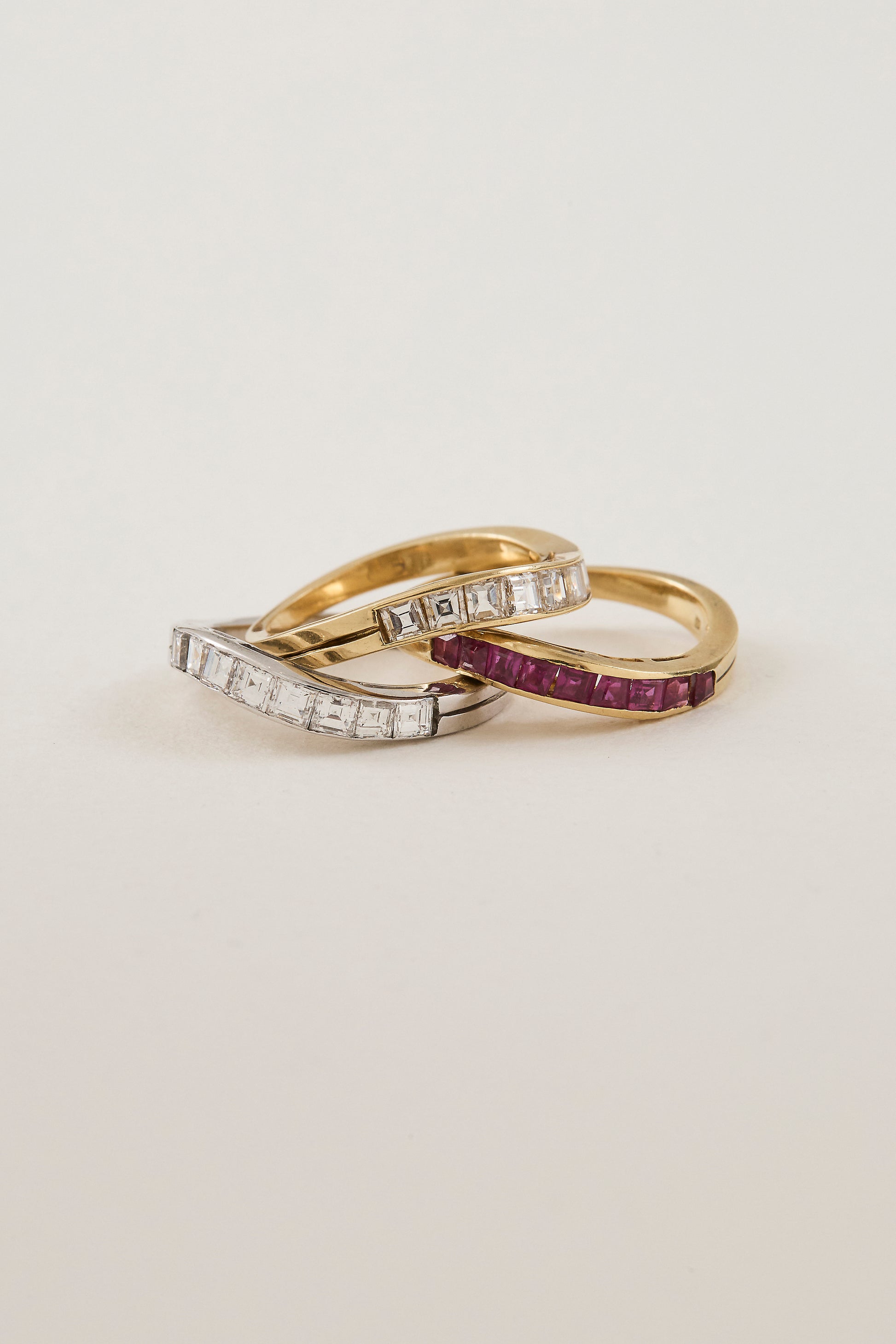 Architectural European vintage silhouettes take centre stage with our vintage ruby and diamond ring set, circa 1940. This sculptural trio captures the essence of refined mid-century design by comprising three individual bands that showcase a highly coveted union of form and colour. Featuring two channel-set diamond bands, totalling 2.20ct of square-cut diamonds, and a ruby band of nine vibrant square-cut rubies totalling 1.10ct, each band curves in soft, deliberate asymmetry, allowing the stones’ geometry to echo one another in perfect alignment. Crafted in 18K yellow and white gold, this statement piece celebrates mid-century modernism and enduring artistry.