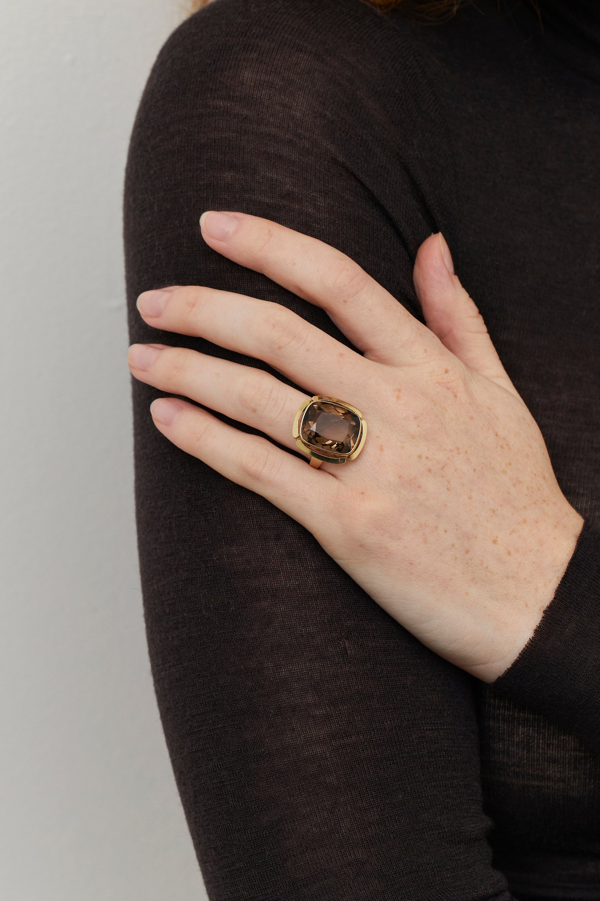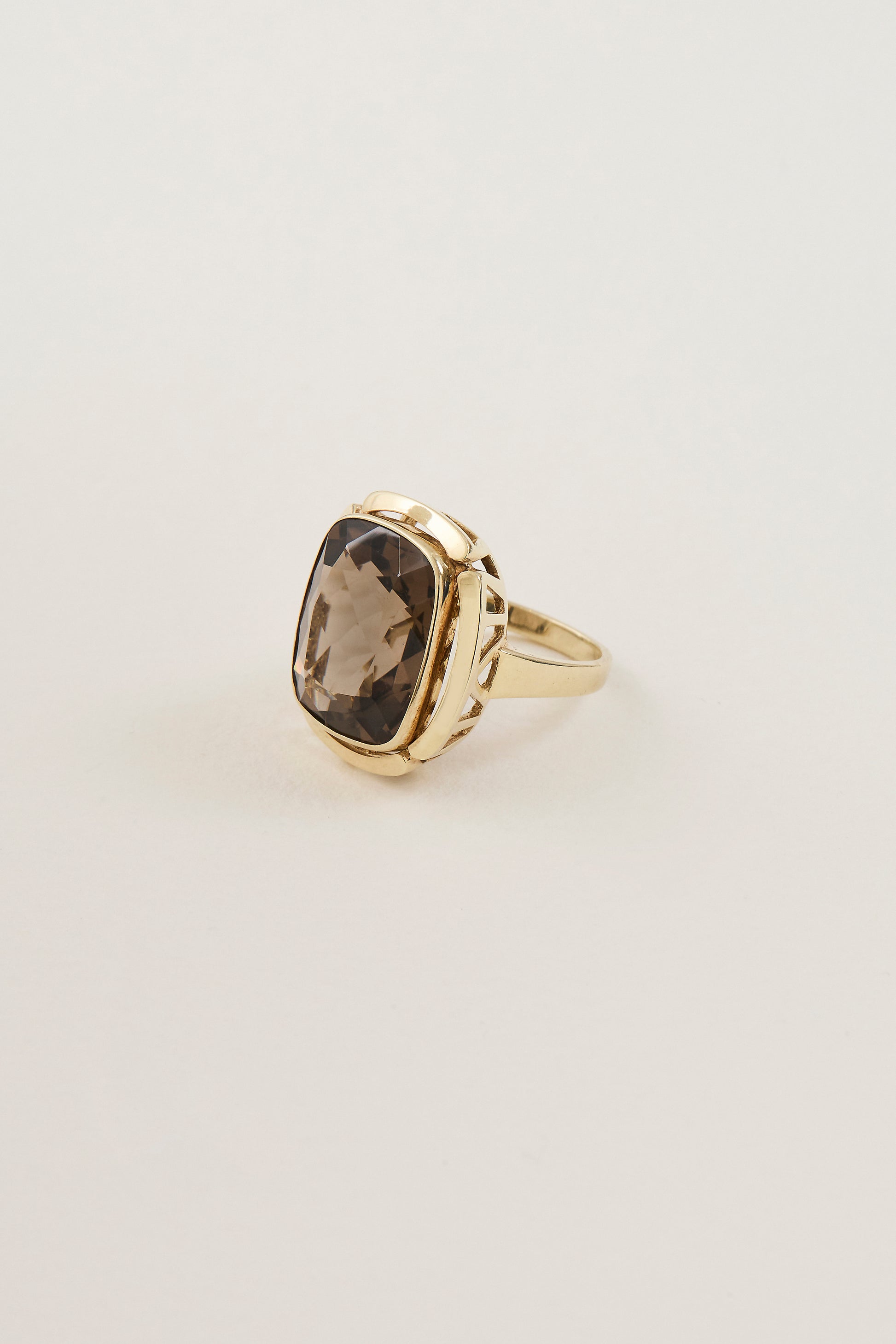 European vintage silhouettes take centre stage with our vintage Smokey Quartz Ring, circa 1940. Transporting you to an era of refined glamour, this vintage 14K yellow gold ring set within a split open bezel, boasts a mesmerising cushion-cut smokey quartz of 12ct. The warm, golden hue of the metal beautifully harmonises with the earthy tones of the gemstone, creating an enchanting contrast. This masterful heirloom evokes a sense of sculptural modernism and enduring sophistication.