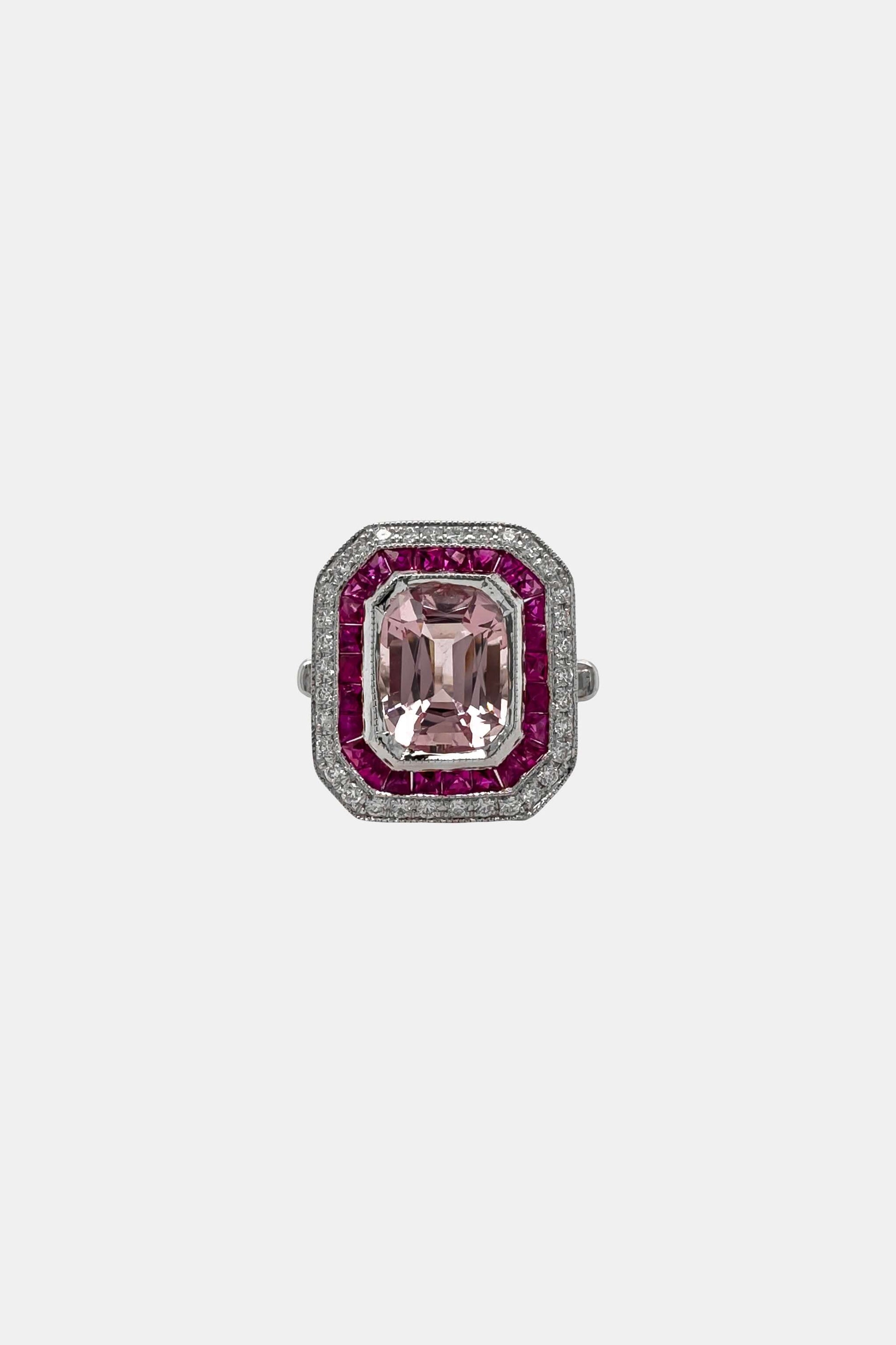 Art Deco aesthetics take a modern approach with refined geometric elegance in Keshett's Art Deco inspired Decadent Ring crafted in 18K white gold. Showcasing a lustrous emerald-cut morganite encased with a decadent double halo of vivid calibre-cut rubies and brilliant-cut diamonds in a milgrain finish, this ring represents Keshett’s foundational approach to reinterpreting traditional Art Deco with a sophisticated and artful sensibility.