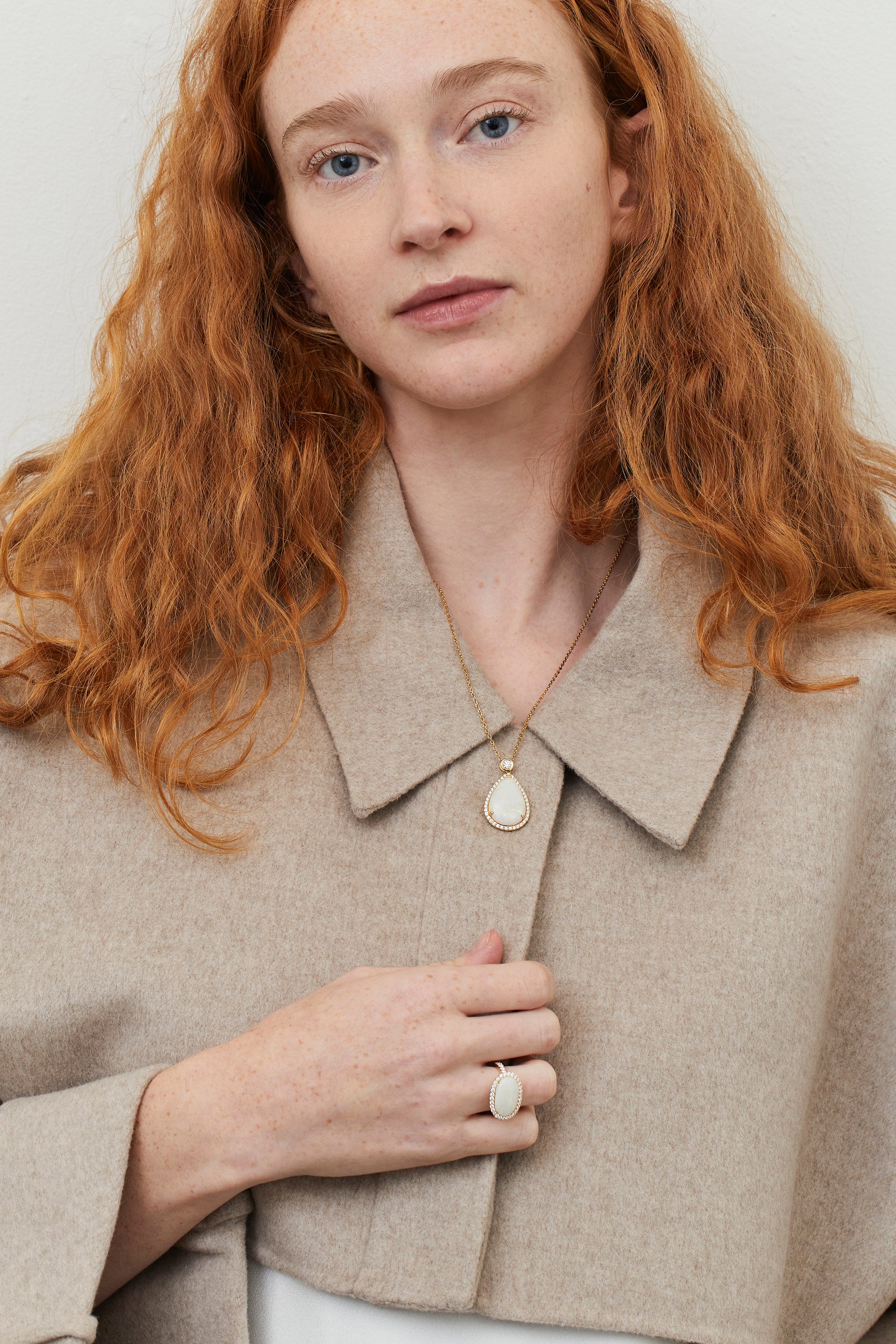 Nestled at the centre of this stunning composition is a resplendent 7.27ct pear-shaped ivory opal that radiates mesmerising rainbow hues with every movement. Encircled by thirty-nine round brilliant-cut diamonds totalling 0.62ct and delicately set in the brilliance of 18K yellow gold, this pendant epitomises elegance and enduring sophistication. A harmonious balance of light, colour, and craftsmanship, refined yet radiant.