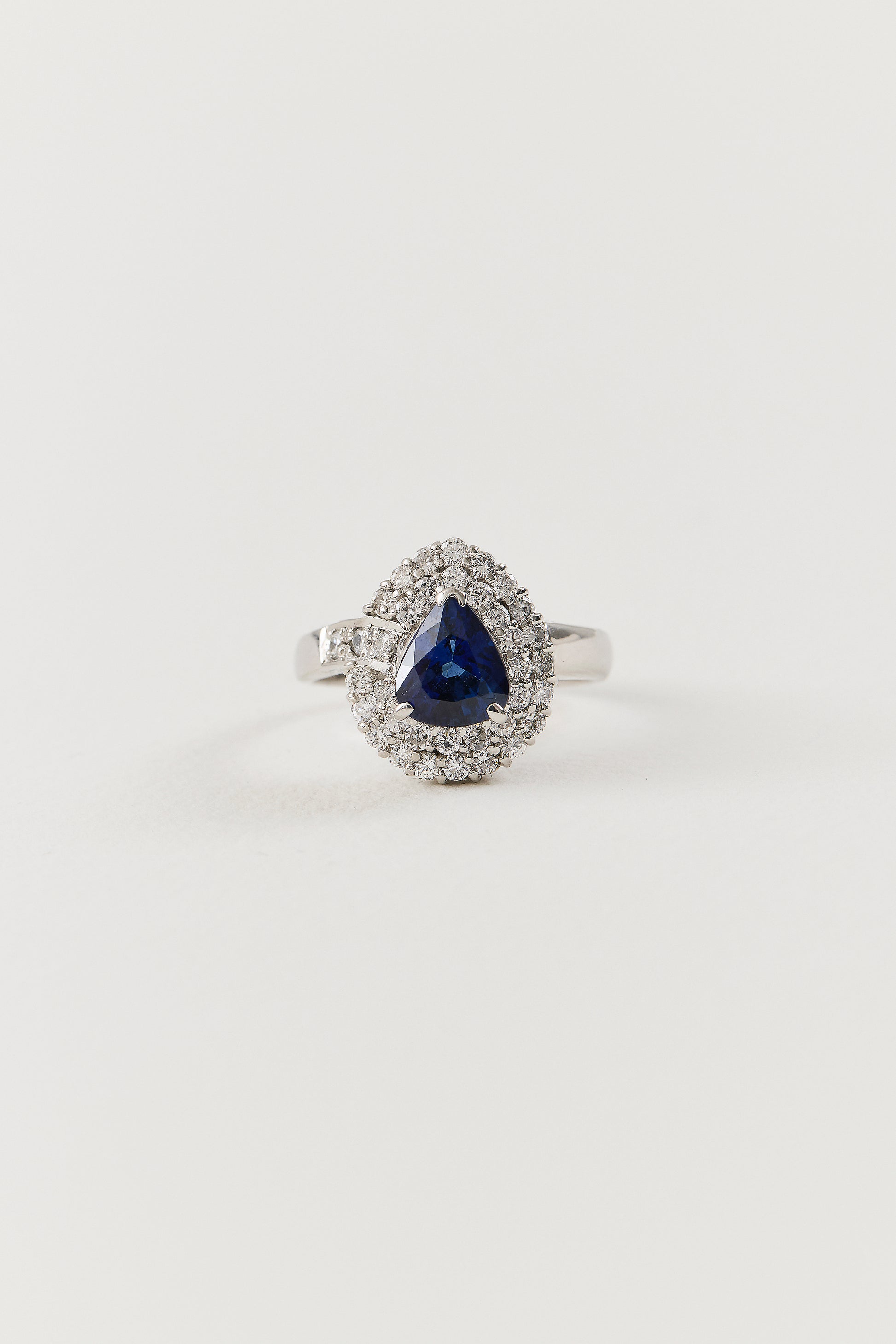 Exploring modern silhouettes with timeless appeal is Keshett’s Pear Sapphire Cluster Ring. Featuring a luminous hand-selected 1.89ct pear-shaped Madagascar sapphire, encircled by a double halo of lustrous round brilliant-cut diamonds weighing 0.77ct, this piece is finished with an interval of diamonds adorning the band. Crafted in platinum, this piece exudes enduring sophistication reflective of Keshett's masterful craftsmanship and foundational elegance.