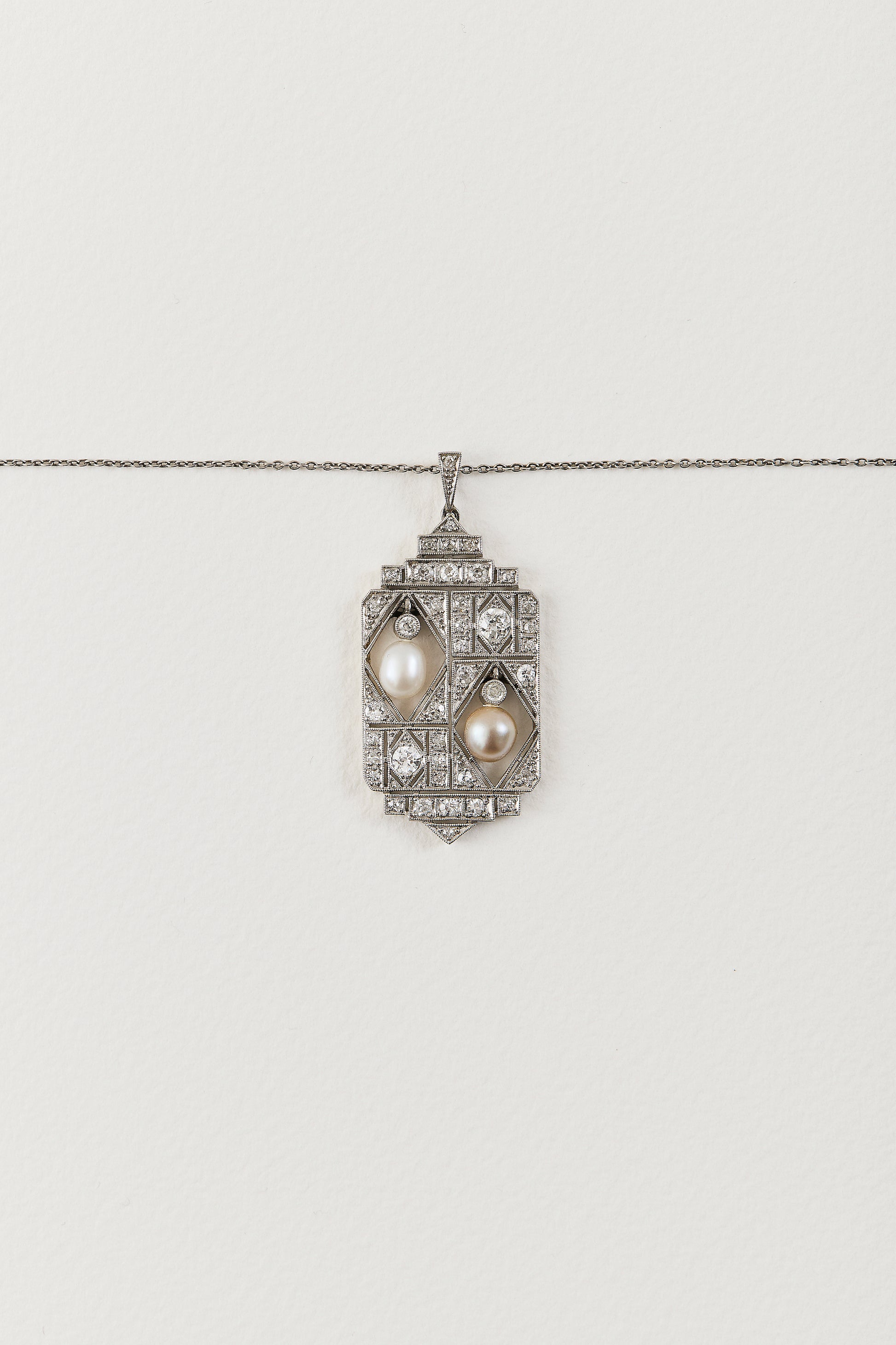 Reimagine modern elegance with an artful play between masculine and feminine with this Art Deco pearl and diamond pendant. Crafted in platinum, this exquisite piece features intricate detailing, openwork and milgrain edges. Old and single-cut diamonds totalling 0.83ct, delicately decorate the pendant, and with the addition of white and grey pearls, this magnificent piece transforms into one of opulence.