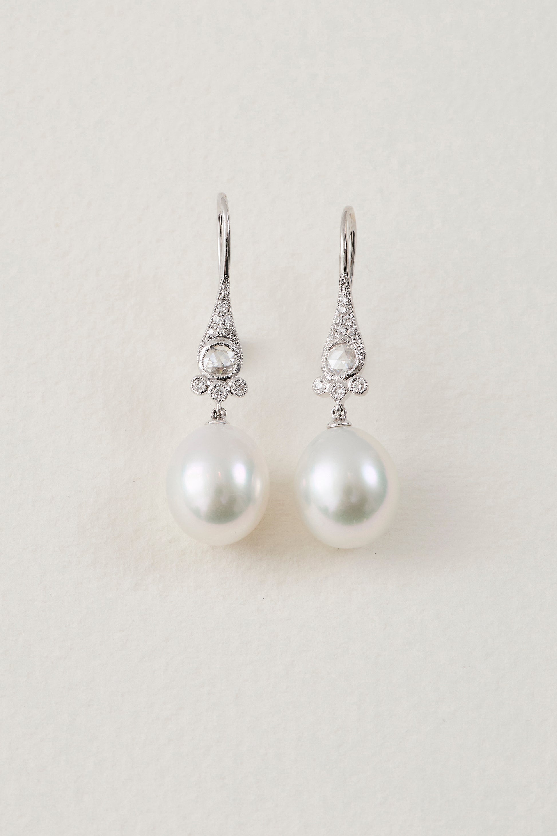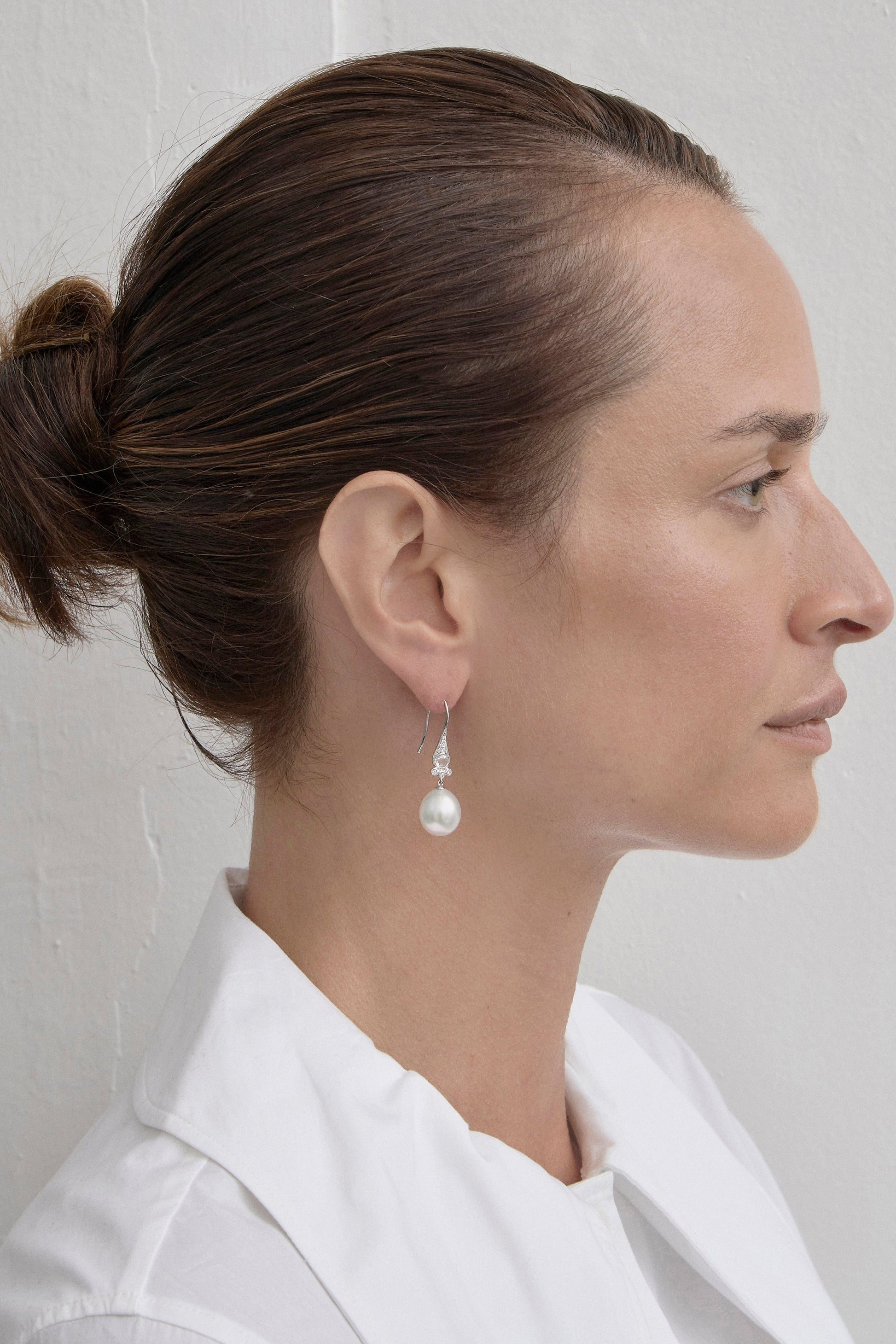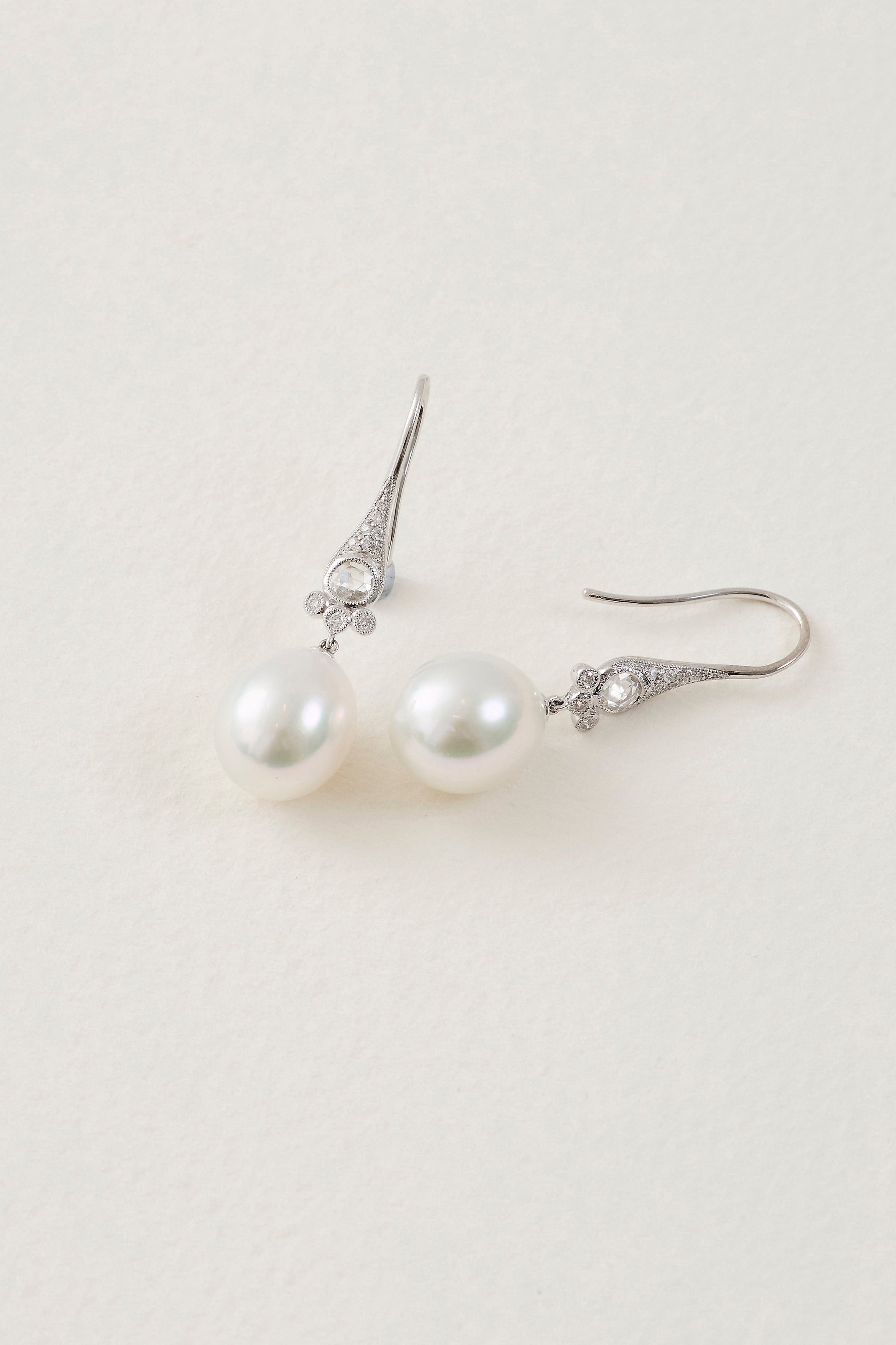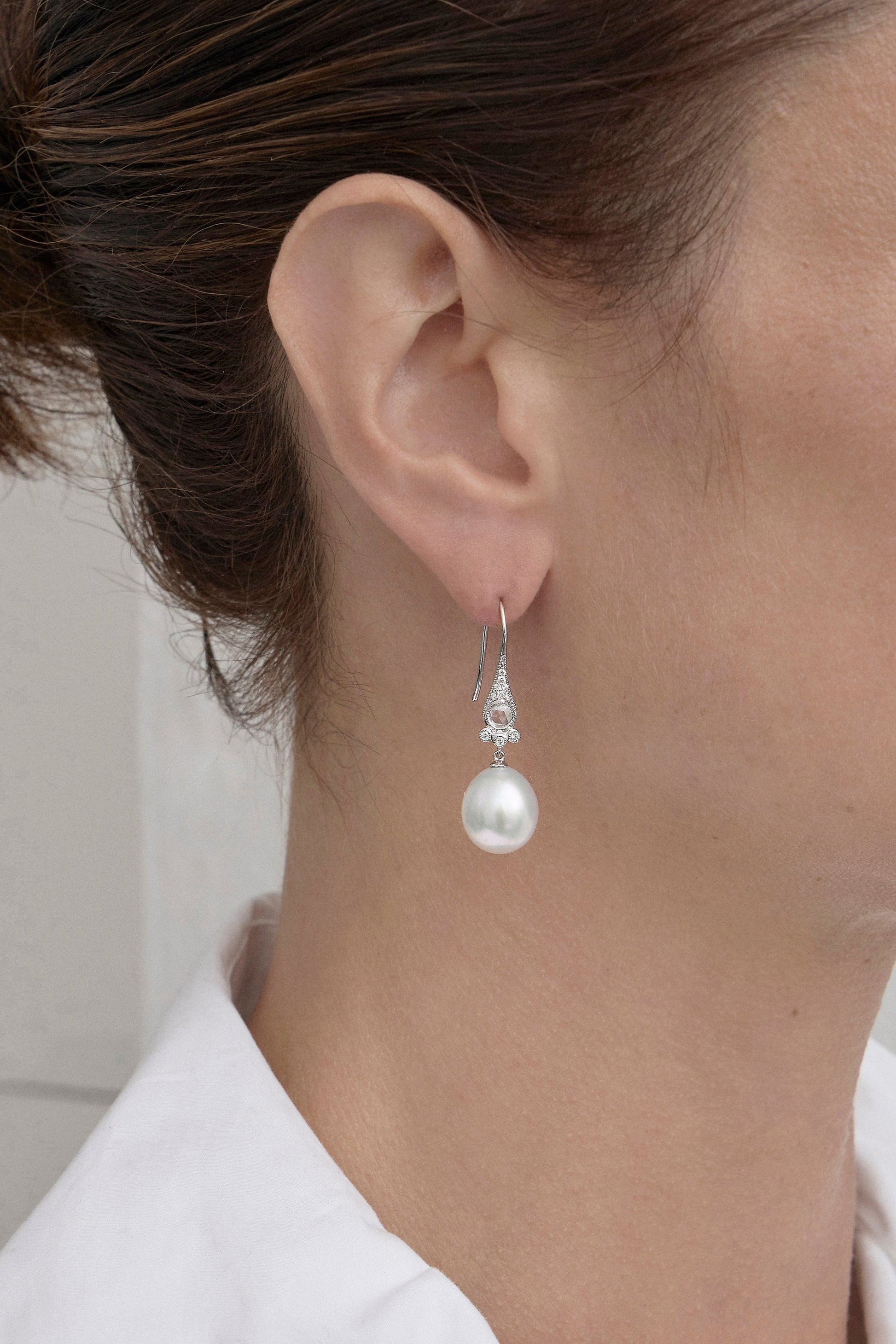 Embodying the essence of feminine iridescence, our Pearl Diamond Drop Earrings seamlessly blend classic elegance with modern sophistication. A luminous rose-cut diamond centerpiece, surrounded by a dazzling halo of pavé-set and bezel-set diamonds (0.39tcw), expertly draws the eye to the majestic white pearls that elegantly dangle below. Crafted in 18K white gold with exquisite milgrain detailing, these earrings showcase Keshett's dedication to refined craftsmanship and timeless luxury.