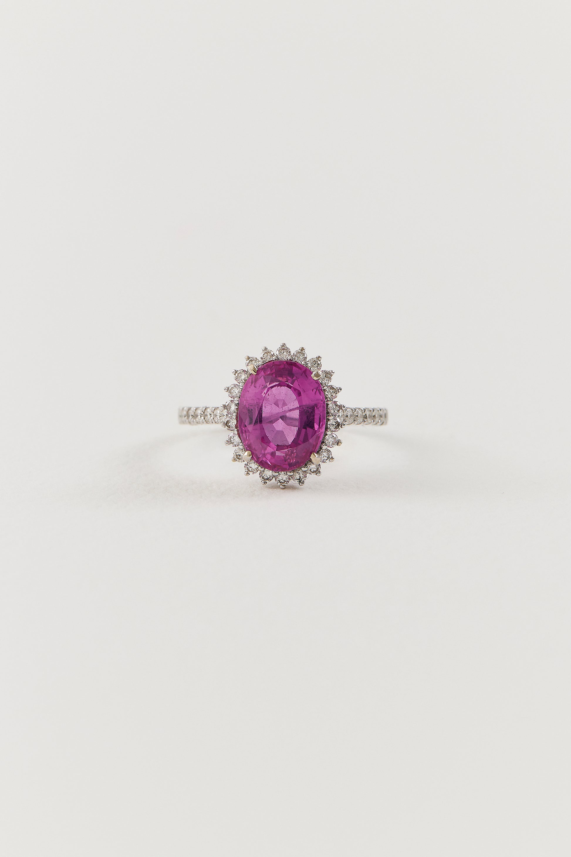 Grandeur and timeless sophistication converge in our Pink Sapphire Ethereal Ring. Showcasing a sublime 5.52ct oval-cut pink sapphire at its heart, the radiant hue and lustrous appearance of the stone emanates modern femininity. Surrounding the sapphire are thirty-six meticulously arranged brilliant-cut diamonds totalling 0.36ct, that form an elegant halo enhancing the overall radiance of the piece. Crafted in 18K white gold, this ring is a masterpiece of contemporary sophistication.