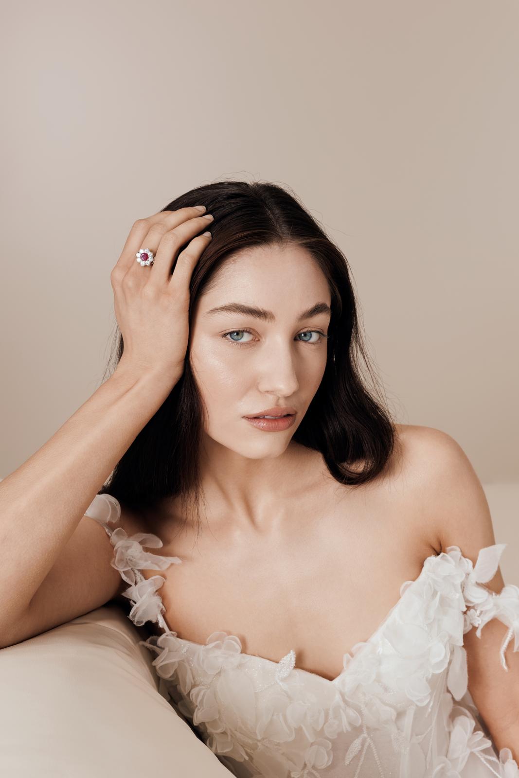 Exploring modern feminine silhouettes with timeless appeal, this exquisite Ruby Ethereal Ring showcases a sublime 0.52ct round-shaped ruby at its heart. Surrounding the lustrous ruby are eight brilliant-cut diamonds, totalling 2.40ct, forming an elegant halo that enhances the overall radiance of the piece. Crafted in 18K white gold, this ring is a masterpiece of contemporary sophistication.