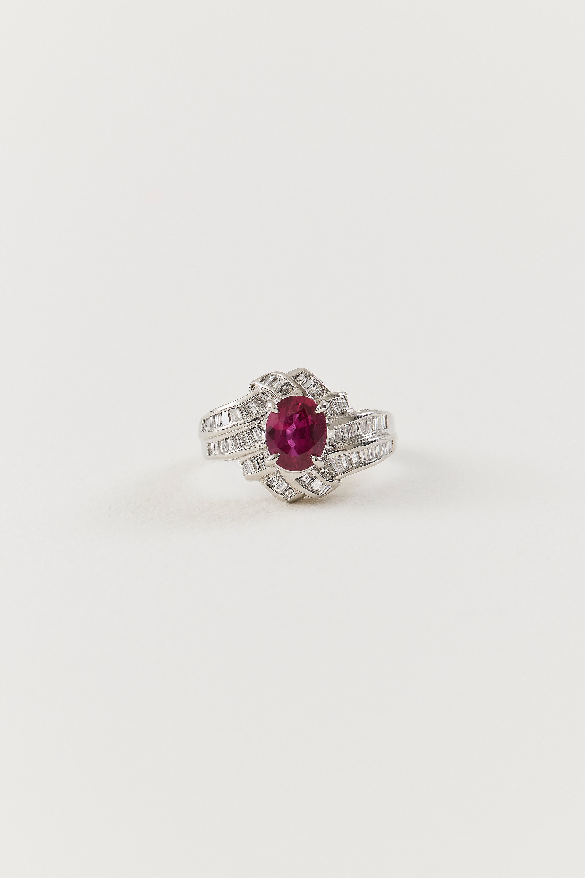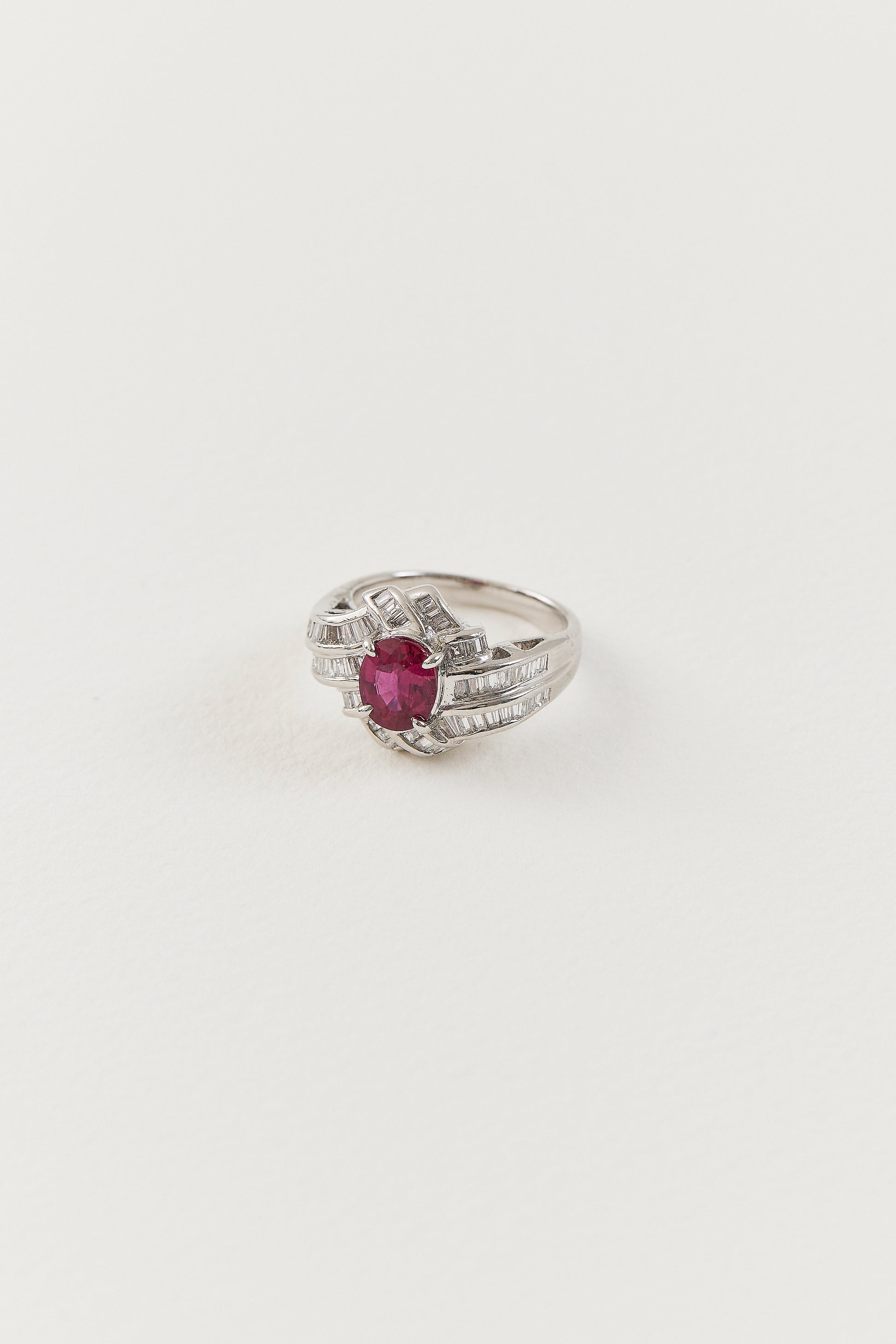 Interplaying vintage silhouettes with a modern design sensibility, our Ruby Vintage Inspired Ring features a radiant 1.43ct oval-cut ruby as its centrepiece. Enveloping the ruby in cascading channel settings are baguette-cut diamonds totalling 0.91ct, set as a luminous backdrop for the central ruby. Handcrafted in platinum, this ring captures the essence of vintage glamour, characterised by bold lines and intricate craftsmanship.