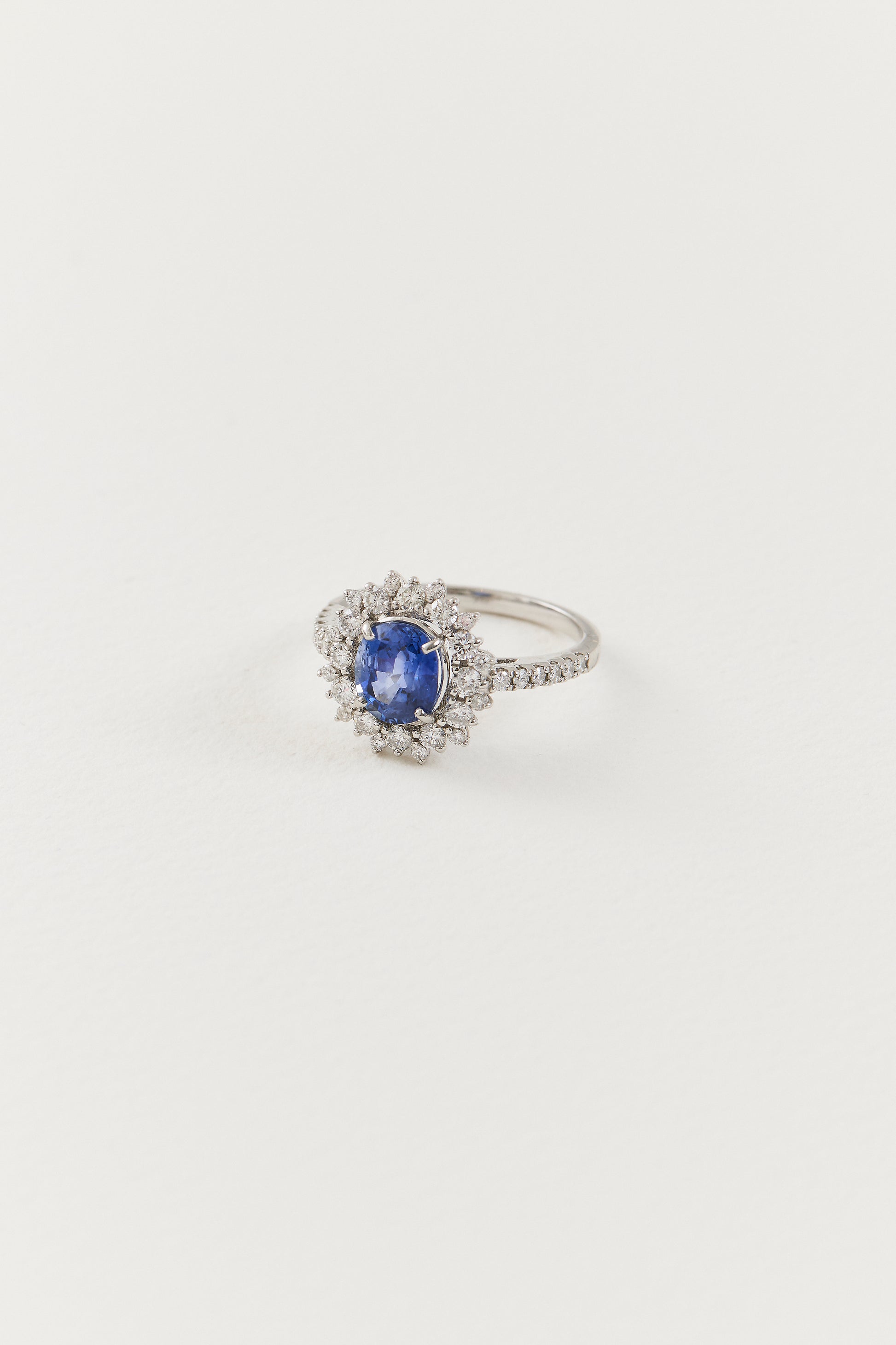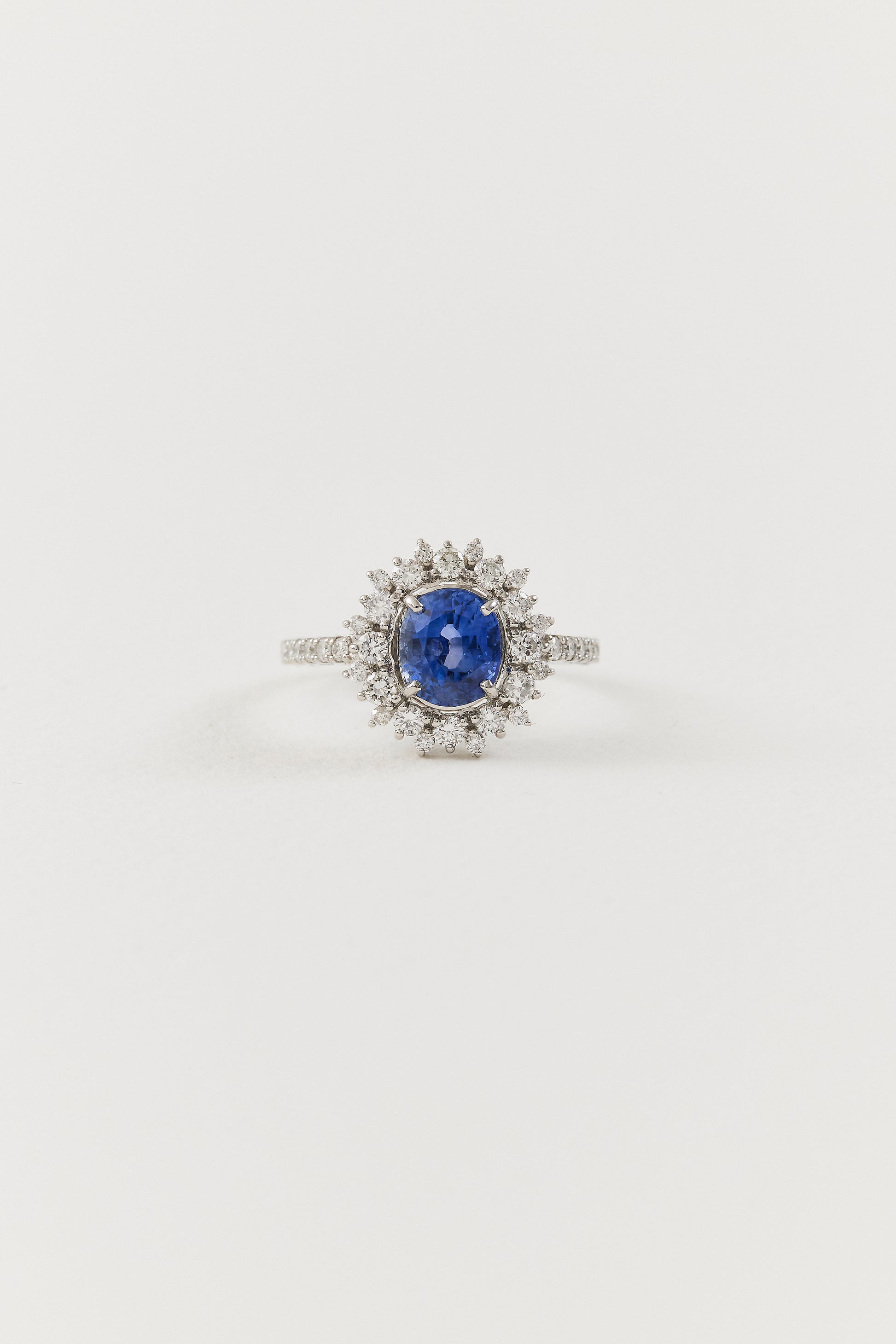 This exquisite Sapphire Cluster Ring showcases a sublime 1.83ct oval-shaped Sri Lankan sapphire at its heart, embodying modern femininity with its radiant, lustrous appearance. Surrounding the central sapphire are 0.67ct of brilliant-cut diamonds that form an elegant halo, enhancing the overall radiance of the piece. Crafted in platinum, this ring is a masterpiece of contemporary sophistication.