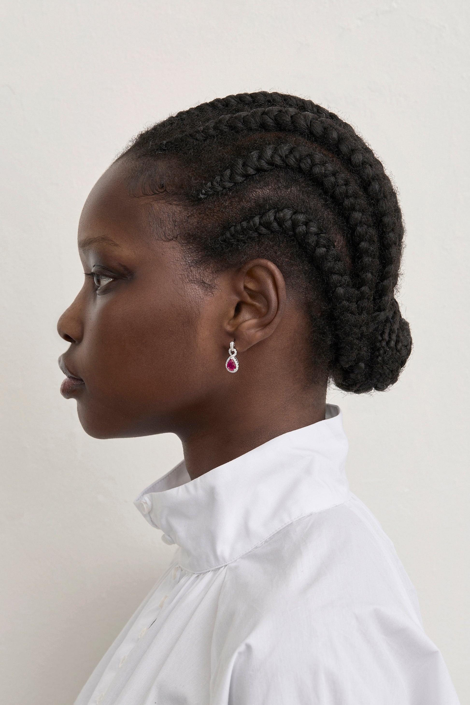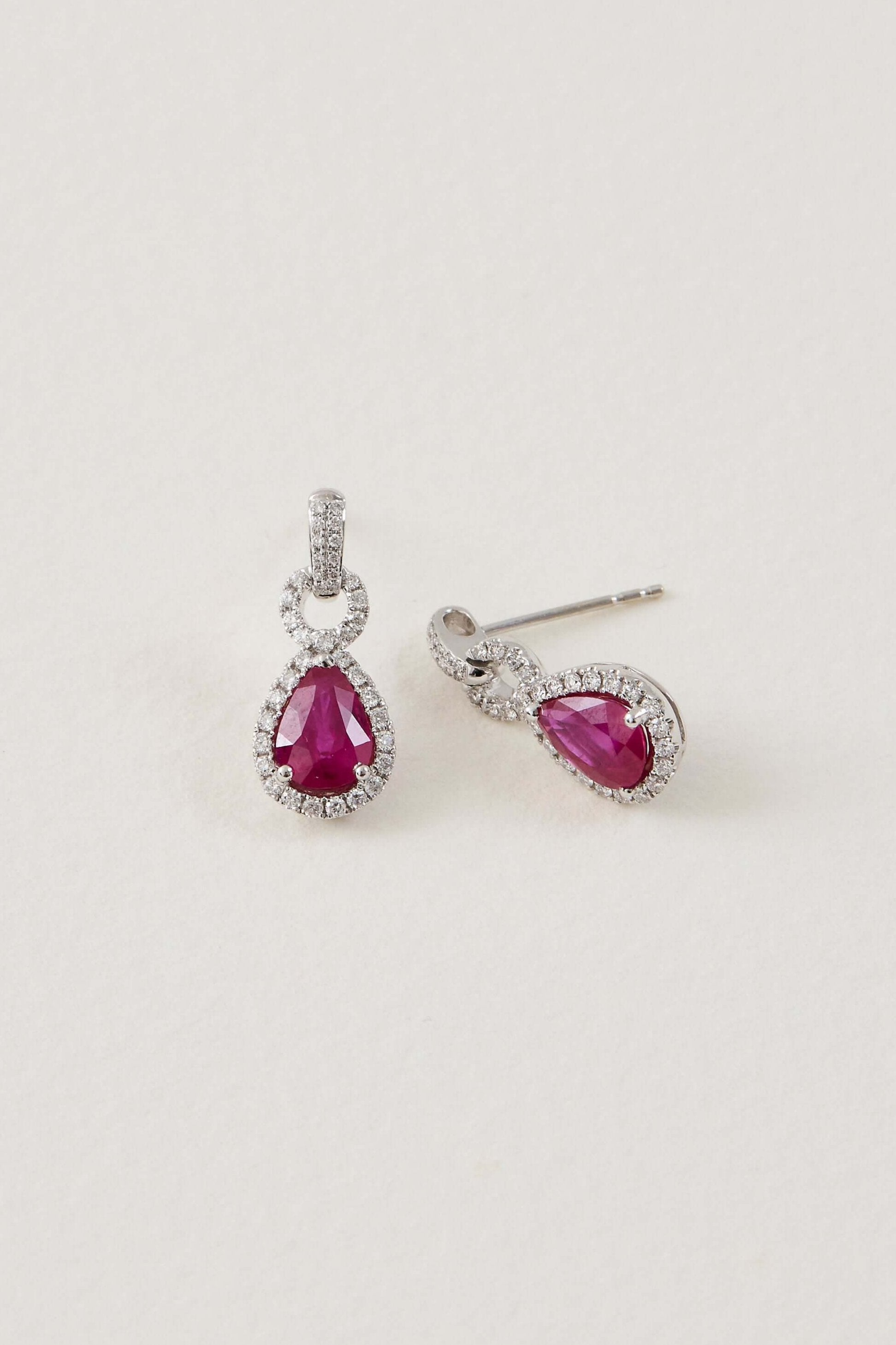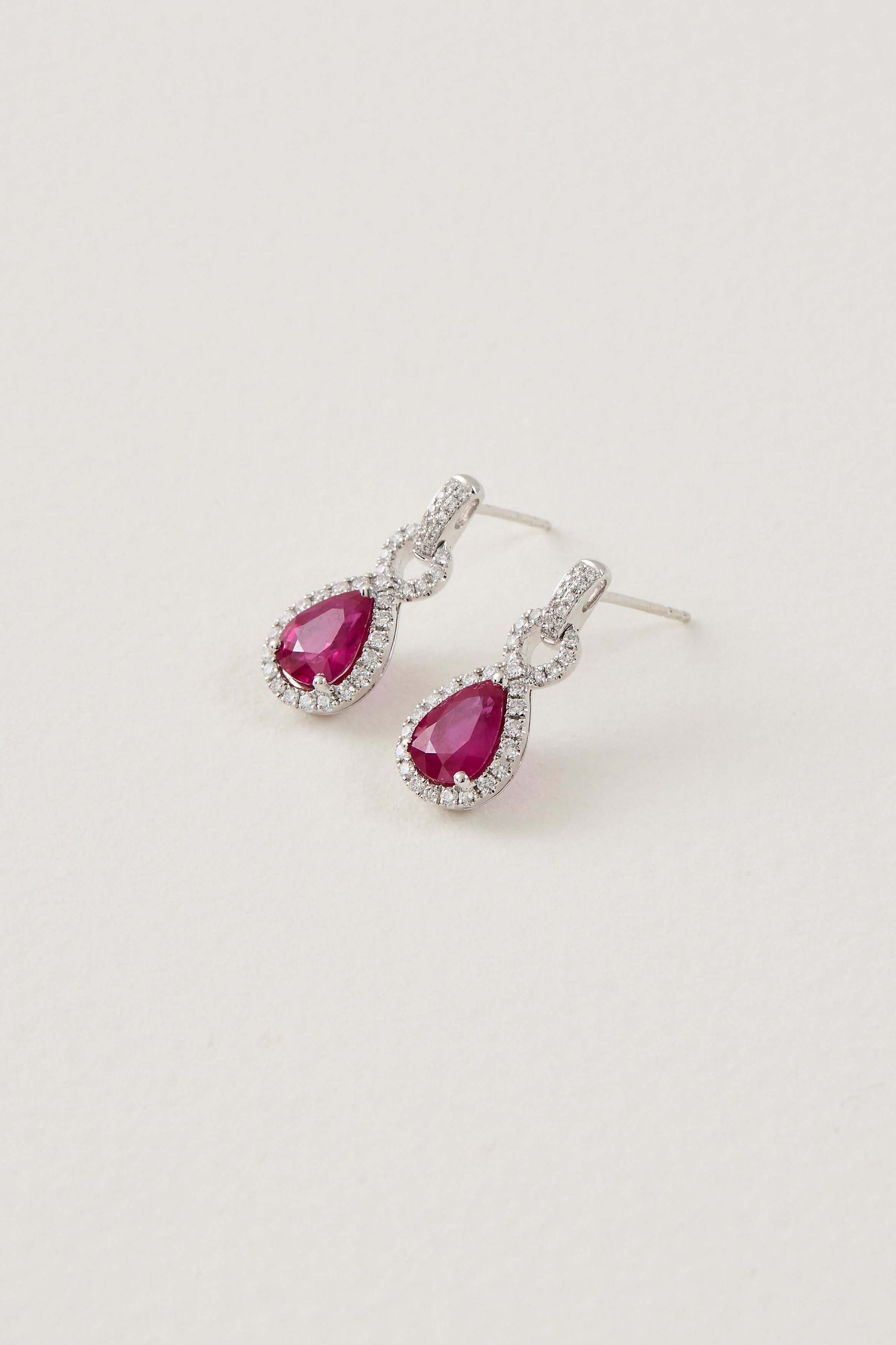 Exuding an ethereal glow, these 18K white gold Ruby Drop Earrings imbue a sense of contemporary sophistication and feminine elegance. Featuring pear-shaped rubies perfectly balanced by the glow of brilliant-cut diamonds, these masterfully crafted earrings showcase a refined sophistication and unparalleled workmanship synonymous with Keshett.
