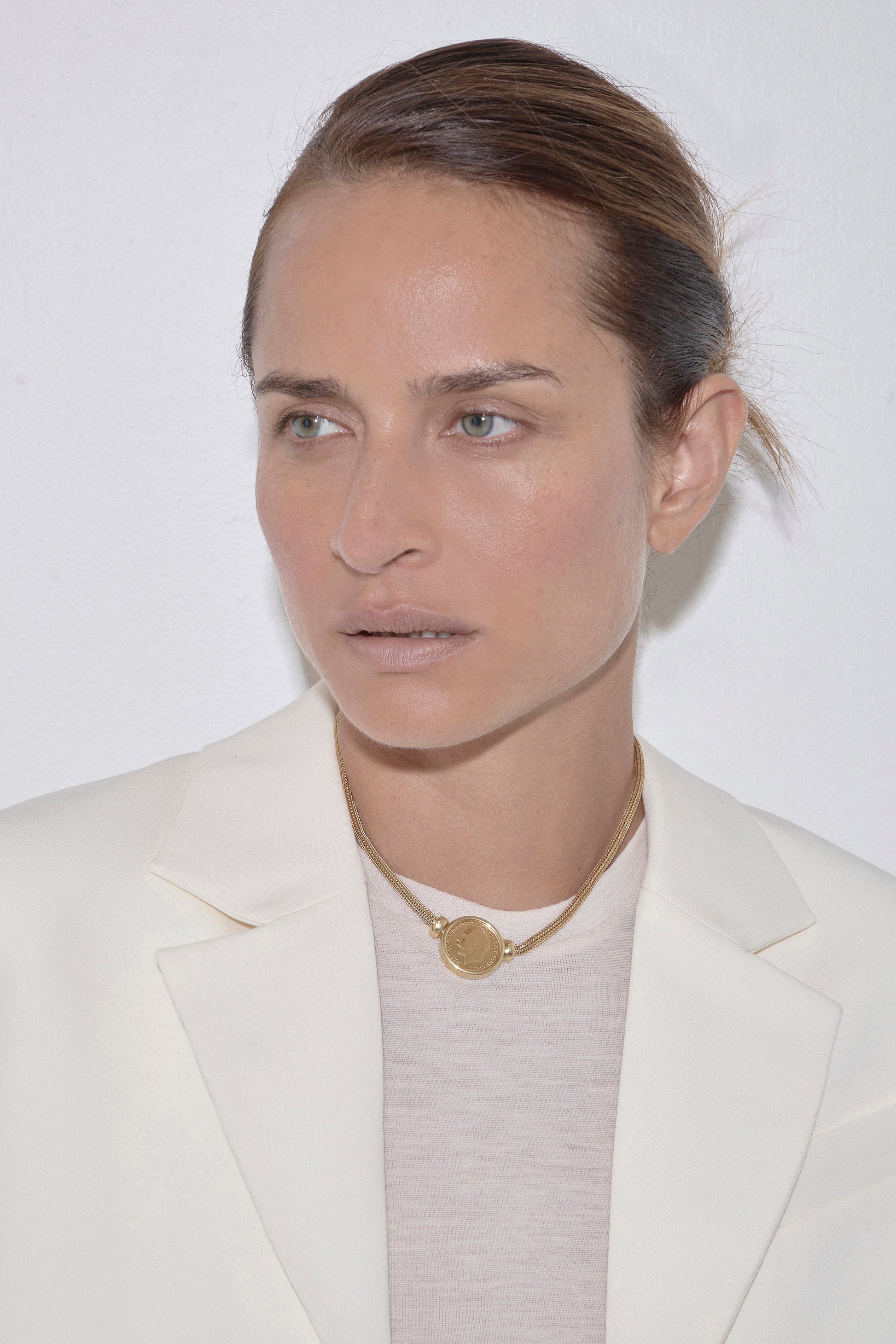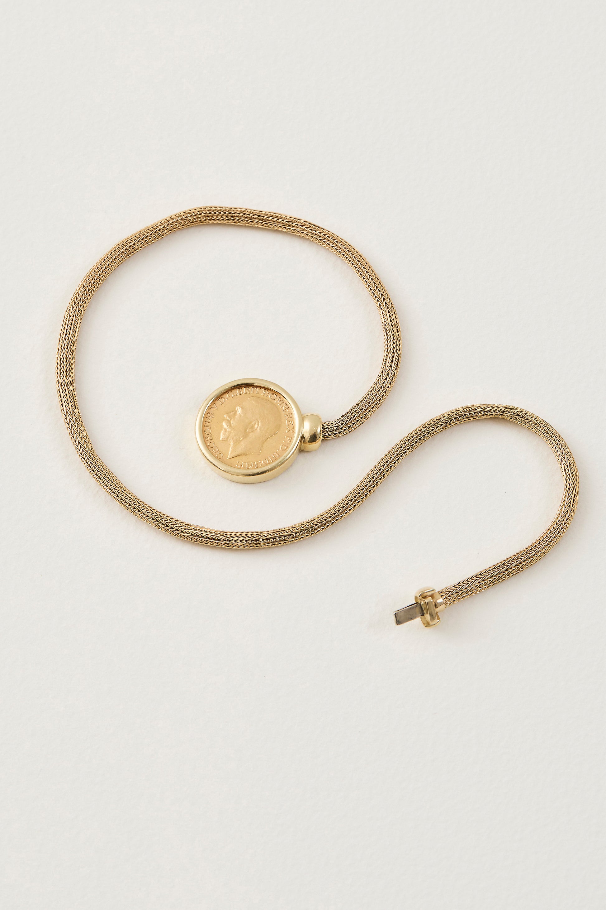 Architectural vintage silhouettes take centre stage with our Sovereign Coin Necklace, circa 1990. Crafted in 18K yellow gold, at its heart lies a sovereign coin clasp, an emblem of historic grandeur and regal sophistication. Adding a touch of architectural marvel to the design, our mesh chain collar is crafted to drape around the neckline with effortless grace. Each link in the chain speaks volumes of the artisan's skill and attention to detail, adding an element of prestige to infuse the piece with a narrative of heritage and significance.