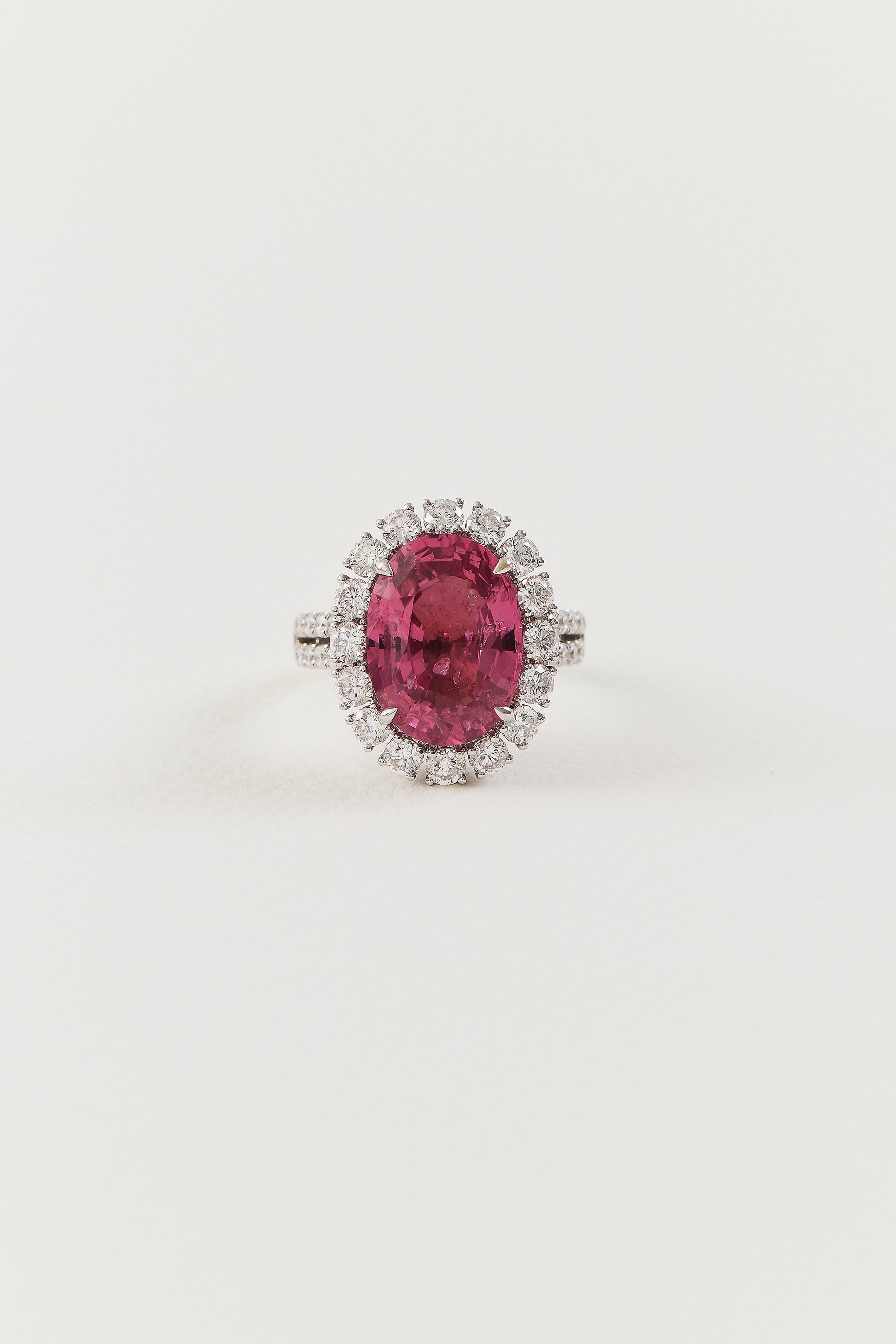 Grandeur and timeless sophistication converge in our Spinel Ethereal Ring. Showcasing a sublime 7.52ct oval-cut spinel at its heart, the radiant hue and lustrous appearance of the stone emanates modern femininity. Surrounding the spinel are forty meticulously arranged brilliant-cut diamonds totalling 1.72ct, that form an elegant halo enhancing the overall radiance of the piece. Crafted in 18K white gold, this ring is a masterpiece of contemporary sophistication.