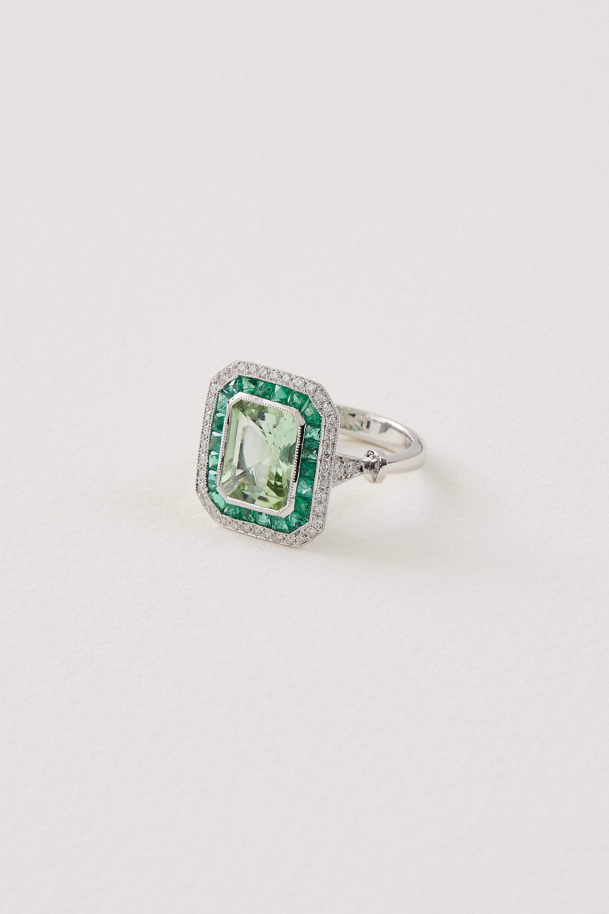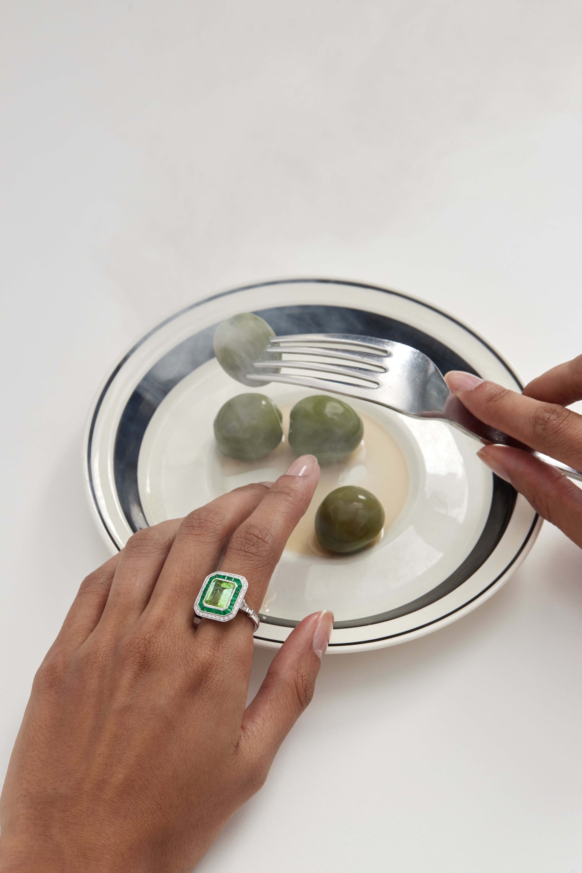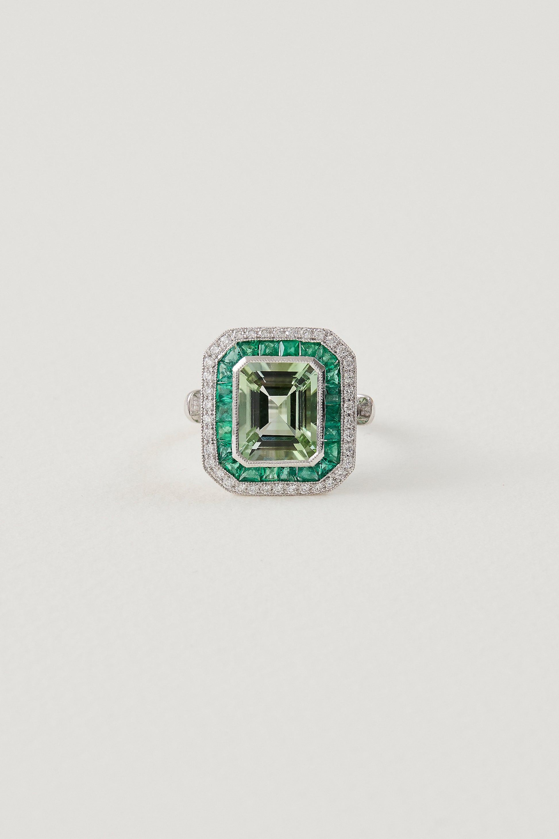 Art Deco aesthetics take a modern approach with refined geometric elegance in Keshett's Art Deco inspired Decadent Ring crafted in 18K white gold. Showcasing a lustrous 3ct emerald-cut tourmaline encased with a decadent double halo of iridescent calibre-cut emeralds (0.66tcw) and brilliant cut diamonds (0.39tcw), this exquisite ring features intricate milgrain edging and diamond-encrusted chevron shoulders. The luxurious design embodies Keshett's signature style, reinterpreting traditional Art Deco with a sophisticated and artful sensibility.