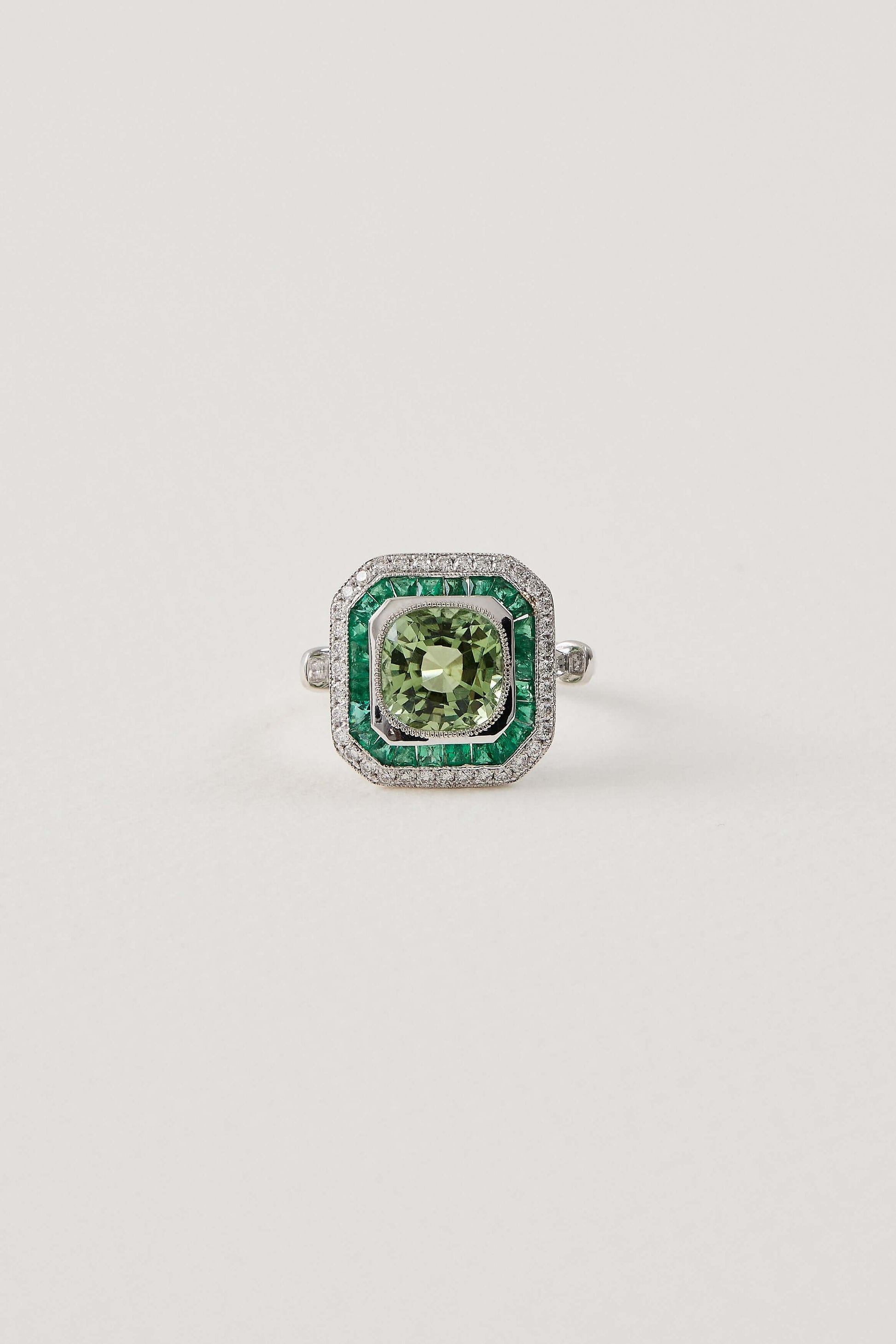 Art Deco archival aesthetics take a modern approach with refined geometric elegance in Keshett's Art Deco inspired Tourmaline Decadent Ring. Showcasing a luminous cushion-cut green tourmaline of 3.31ct at its centre, a halo of iridescent calibre-cut emeralds (0.75tcw) and brilliant-cut diamonds (0.39tcw) surround the centre stone with openwork between the tourmaline and its halo. This ring crafted in 18K white gold represents Keshett’s foundational approach to reinterpreting Art Deco with a sophisticated and artful sensibility.