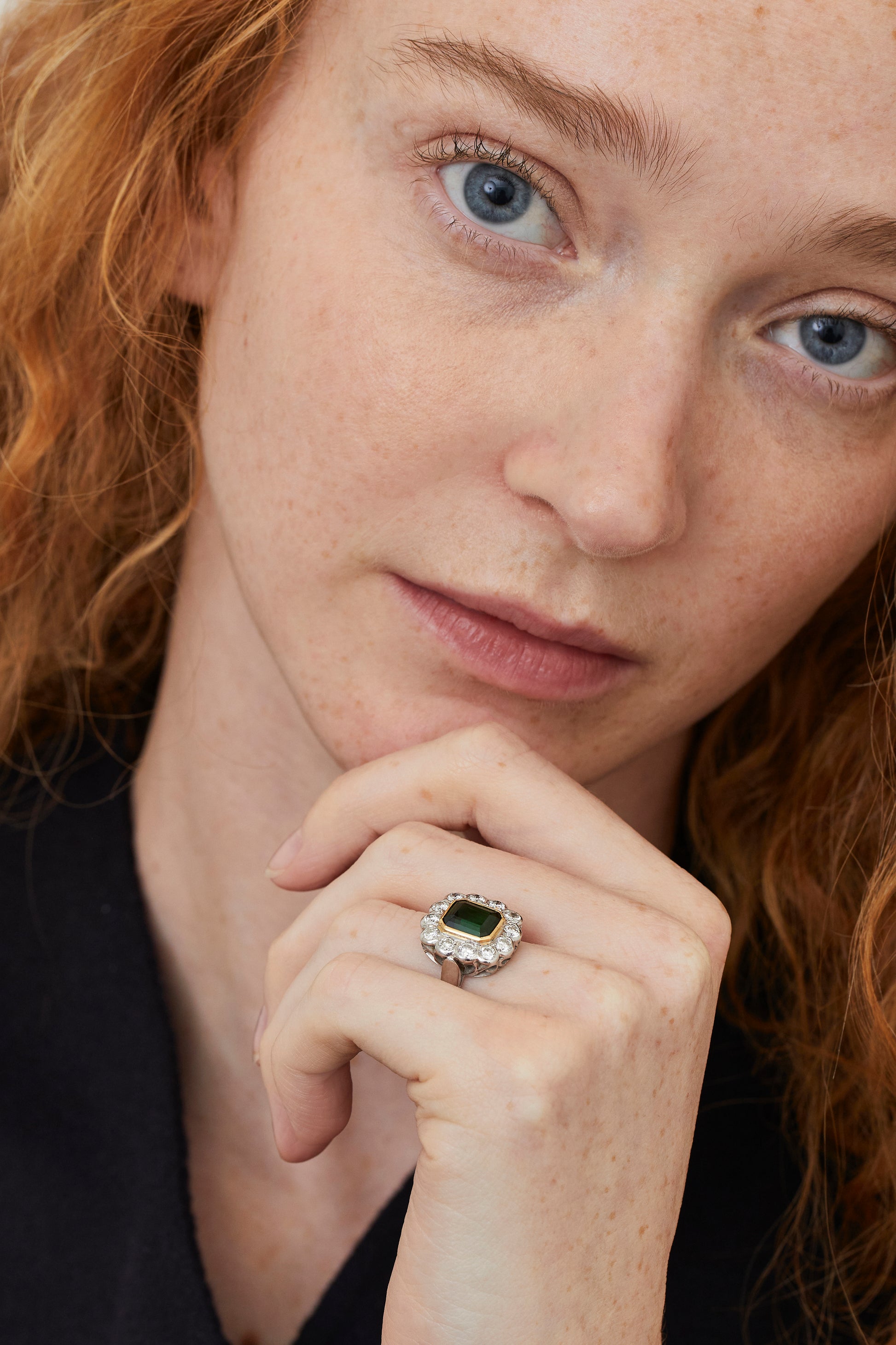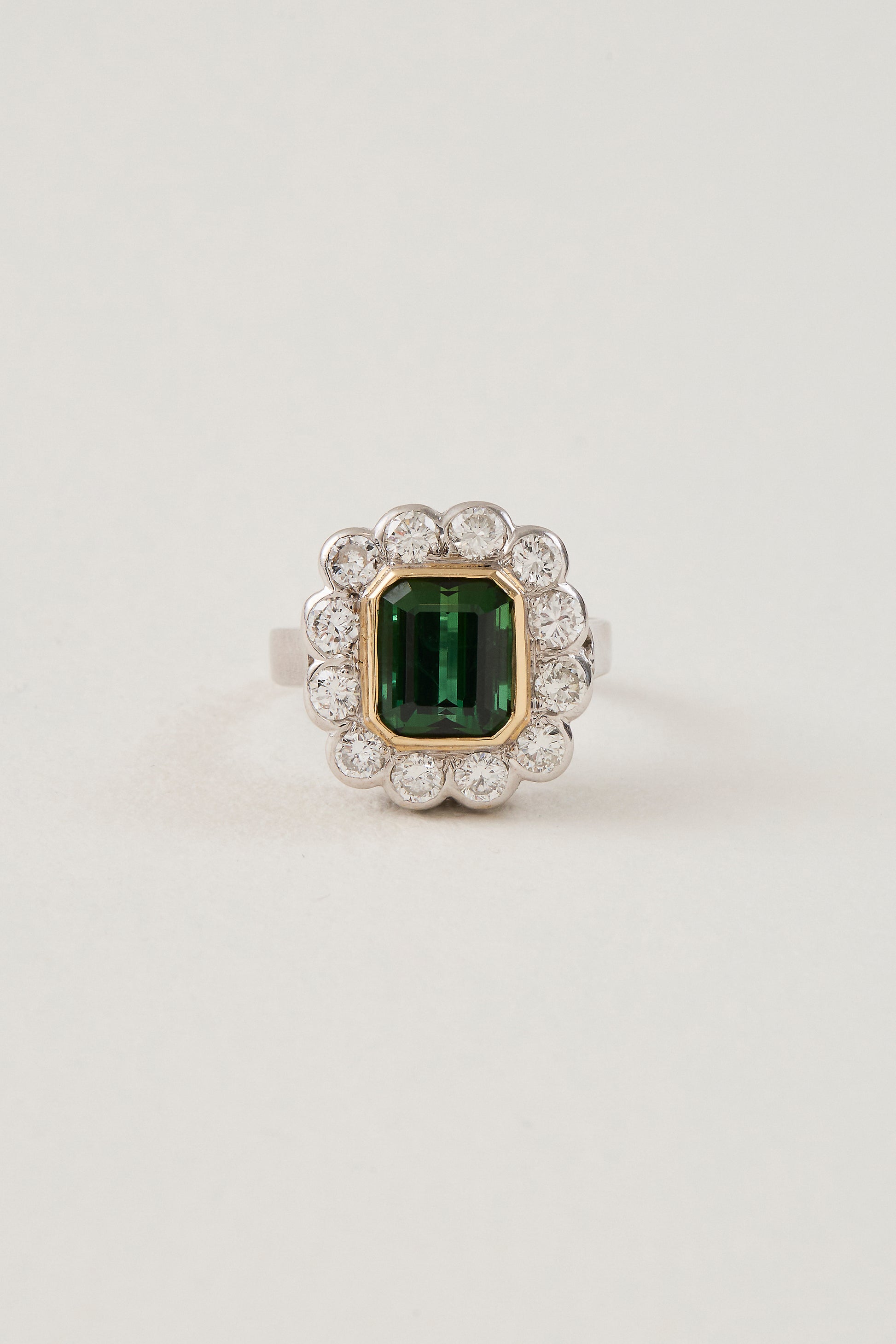 A vintage treasure, this exquisite cluster ring showcases a lustrous 2.20ct green tourmaline encased within a bold yellow bezel, surrounded by twelve luminous bezel-set round brilliant diamonds totalling 0.75ct. Crafted in 18K white gold this ring features a decorative basket that adds a touch of classic sophistication to this beautiful piece.