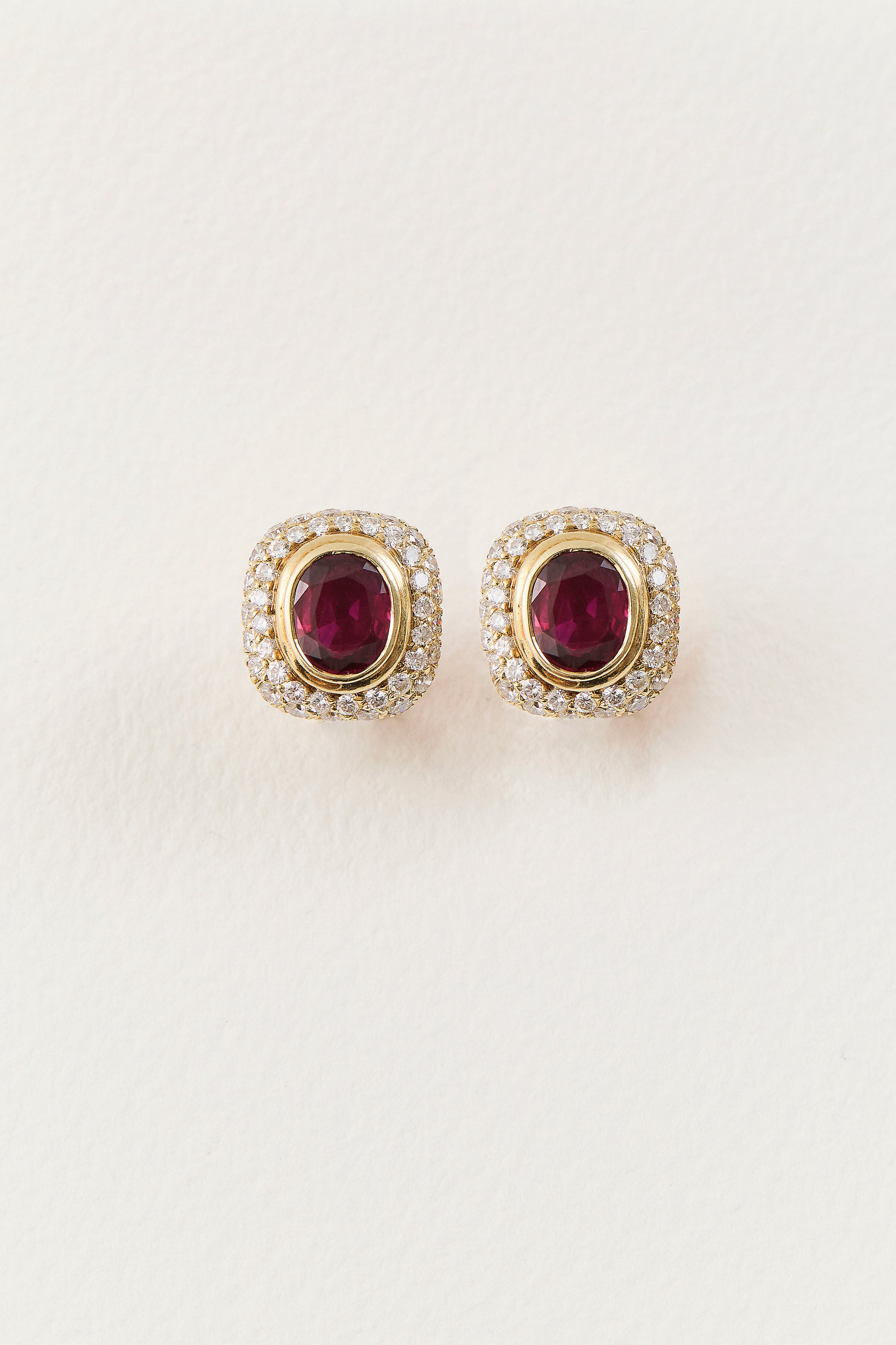 Showcasing a divine silhouette with timeless appeal, these highly collectable 18K yellow gold Vintage Cartier Ruby Studs feature 3ct of oval-cut rubies set within a warm yellow gold bezel. Encircling the rubies are eighty-four lustrous brilliant-cut diamonds, weighing a total of 1.26ct, that create a sense of luxury, as they illuminate the deep hue of the rubies. These earrings offer a harmonious blend of sophistication and refinement for pierced ears or can be worn on the lobes as clip-ons with the removable posts.