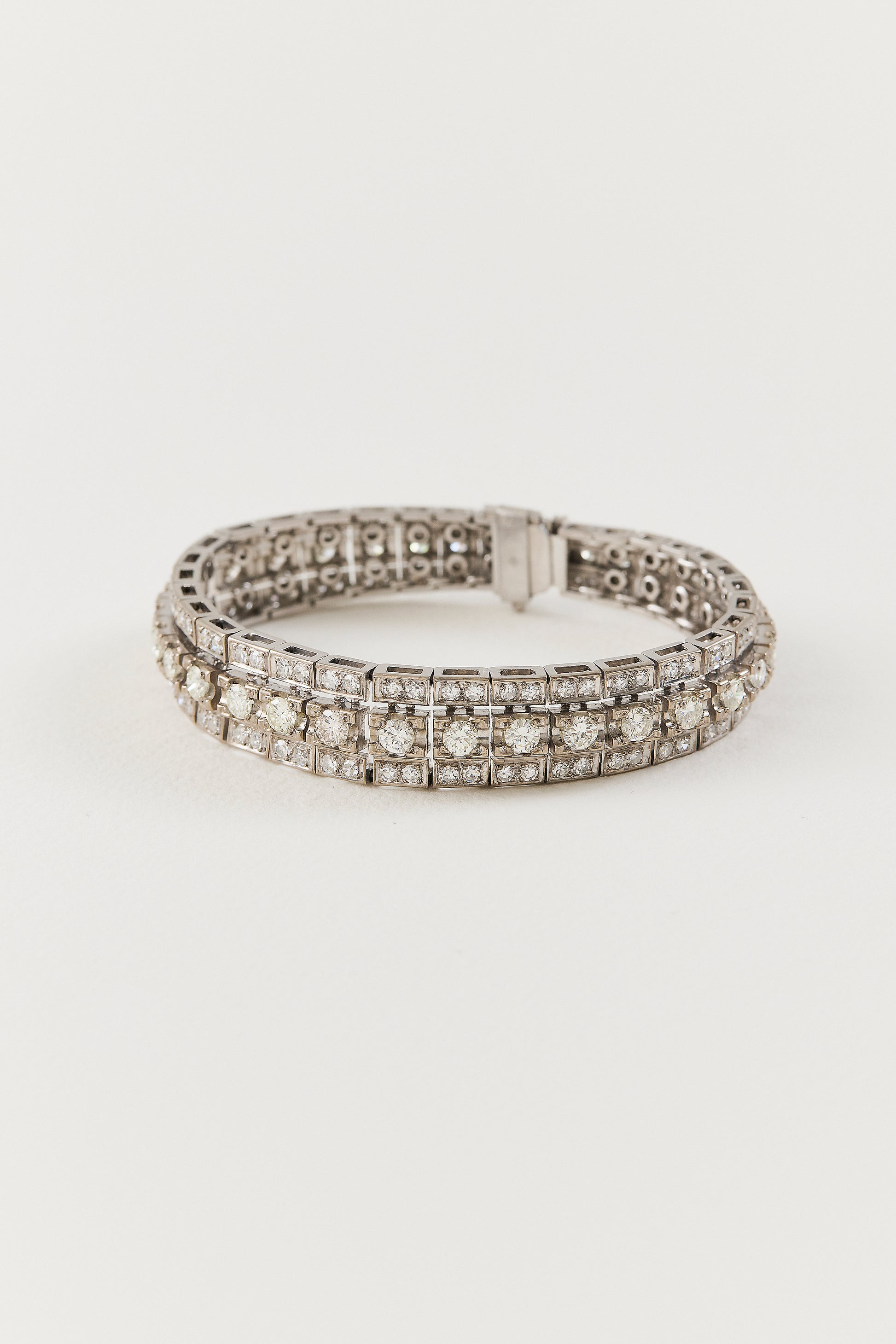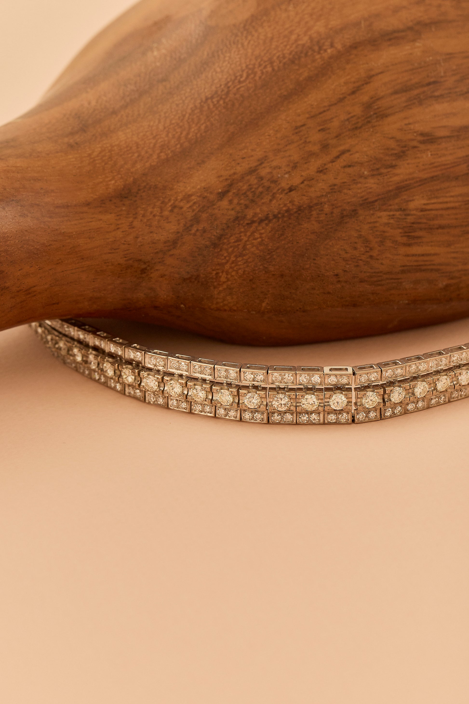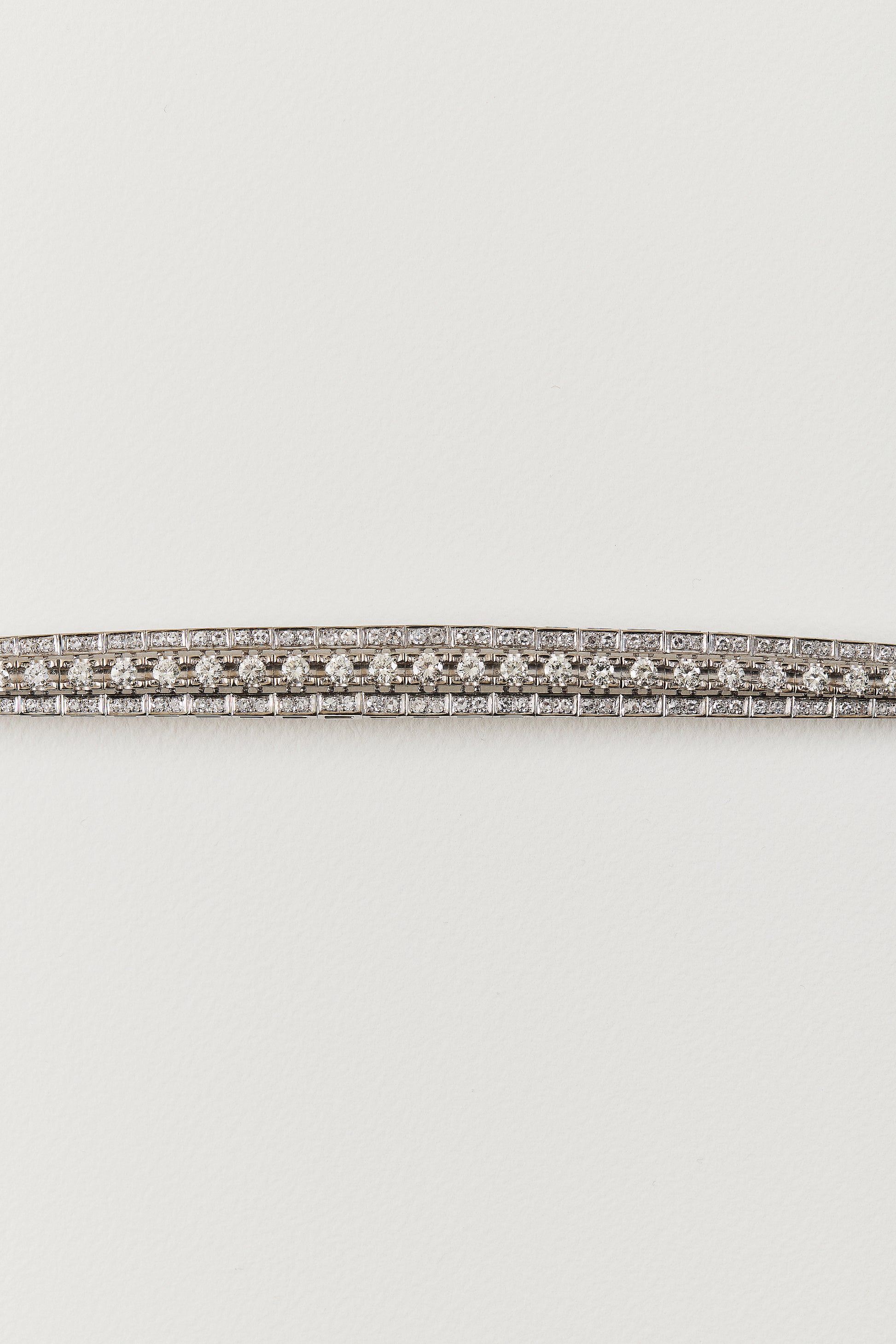 With its triad rows of sparkling diamonds and elegant cascading design, our Vintage Cascade Diamond Bracelet is a masterpiece handcrafted in the 1950’s. Featuring a graduating procession of thirty-three transitional-cut diamonds totalling 4.55ct in the centre, two rows of one single-cut diamonds totalling 2.00ct frame the central diamonds. Crafted in 18K white gold, this piece exudes timeless luxury and sophistication and is a true treasure for those who appreciate the art of pronounced jewellery.