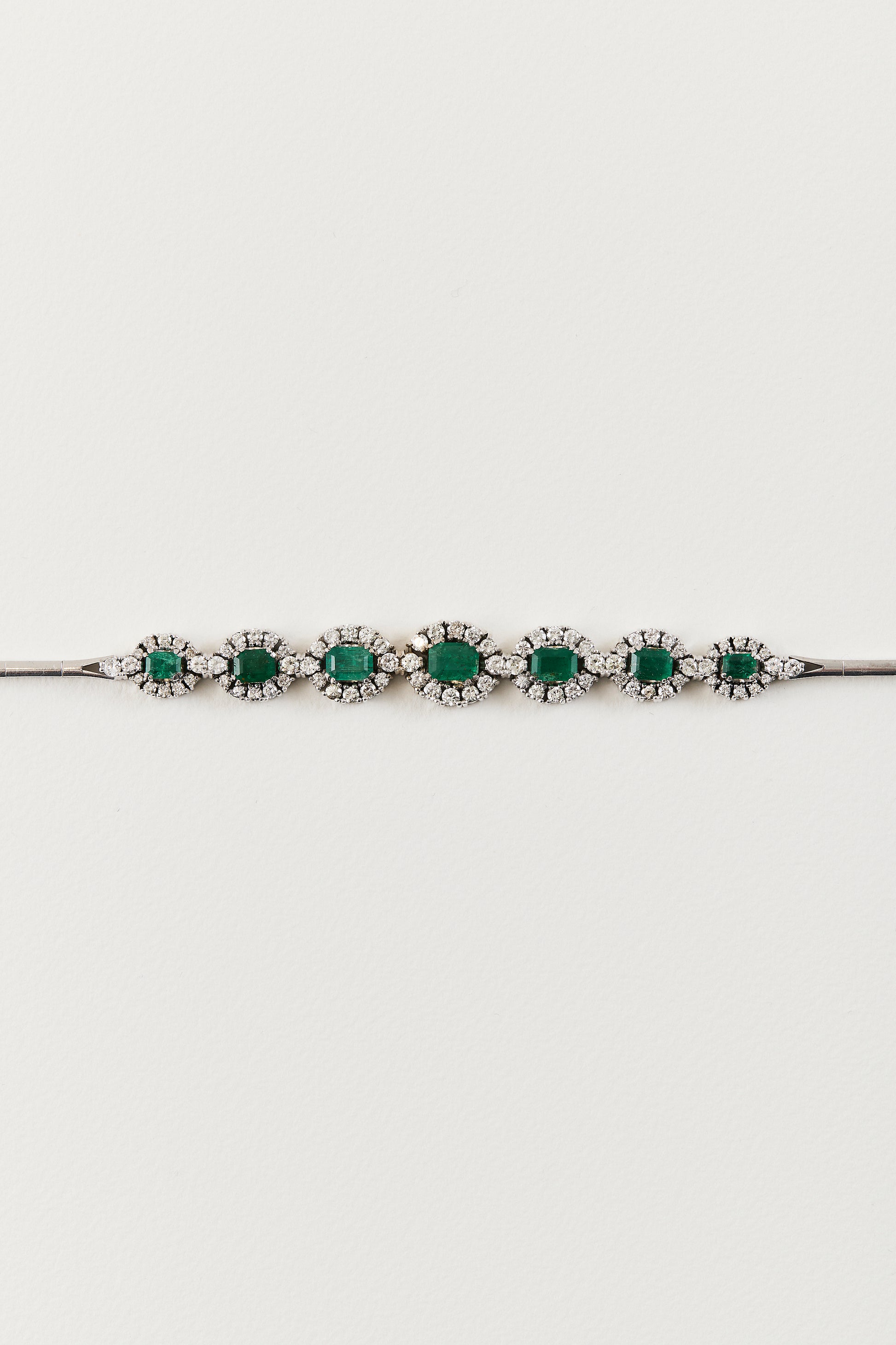 Meticulously crafted in the 1950s, this 14K white gold Vintage Emerald Tennis Bracelet is a masterful blend of captivating detail and classic elegance. This exquisite piece is adorned with seven graduating alluring emerald-cut emeralds totalling 4.13ct, surrounded by halos of eighty-six brilliant-cut diamonds, totalling 3.92ct. Accentuated by luminous diamond bars between the halo formation, every detail of this bracelet is an ode to classic vintage sophistication, and is destined to be cherished as a family heirloom for generations to come.