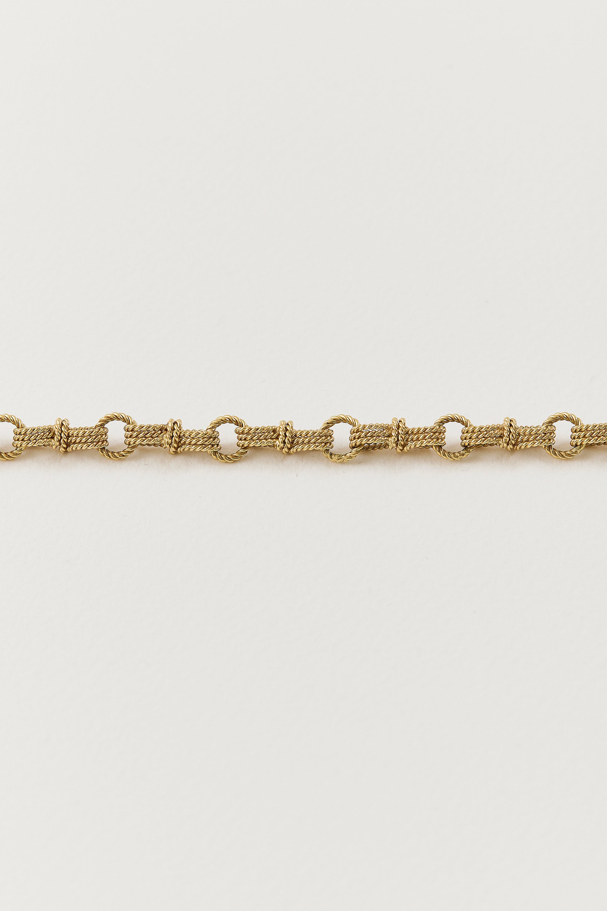 Embodying architectural silhouettes, this Vintage Rope Chain, circa 1940, boasts prestigious gold artwork crafted from lustrous 18K yellow gold. The layered texture of twisted gold adds a dynamic dimension to the piece by creating a sense of fluidity and movement. This chain is a testament to the unparalleled artistry and meticulous attention to detail characteristic of vintage goldsmithing.